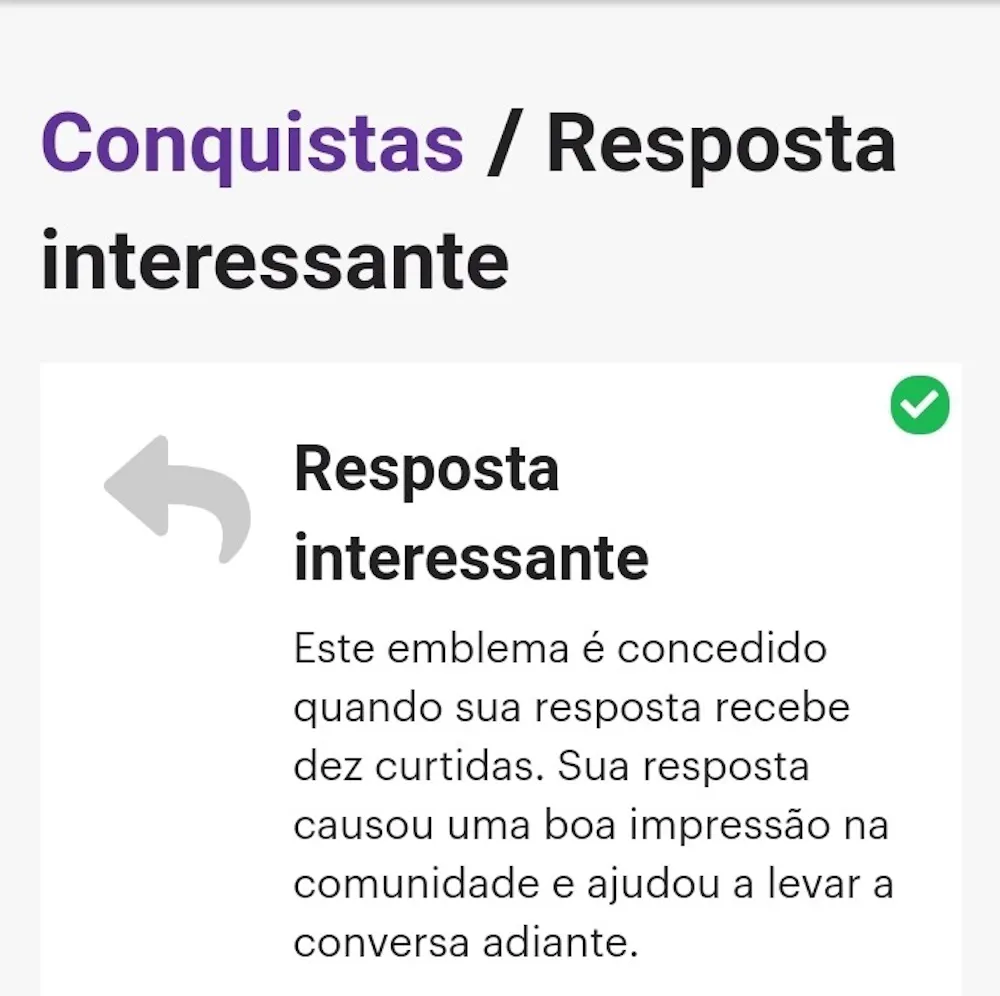 Uma conquista que sempre chama a minha atenção é a Resposta interessante .Ela é recebida quando a sua resposta recebe dez curtidas.