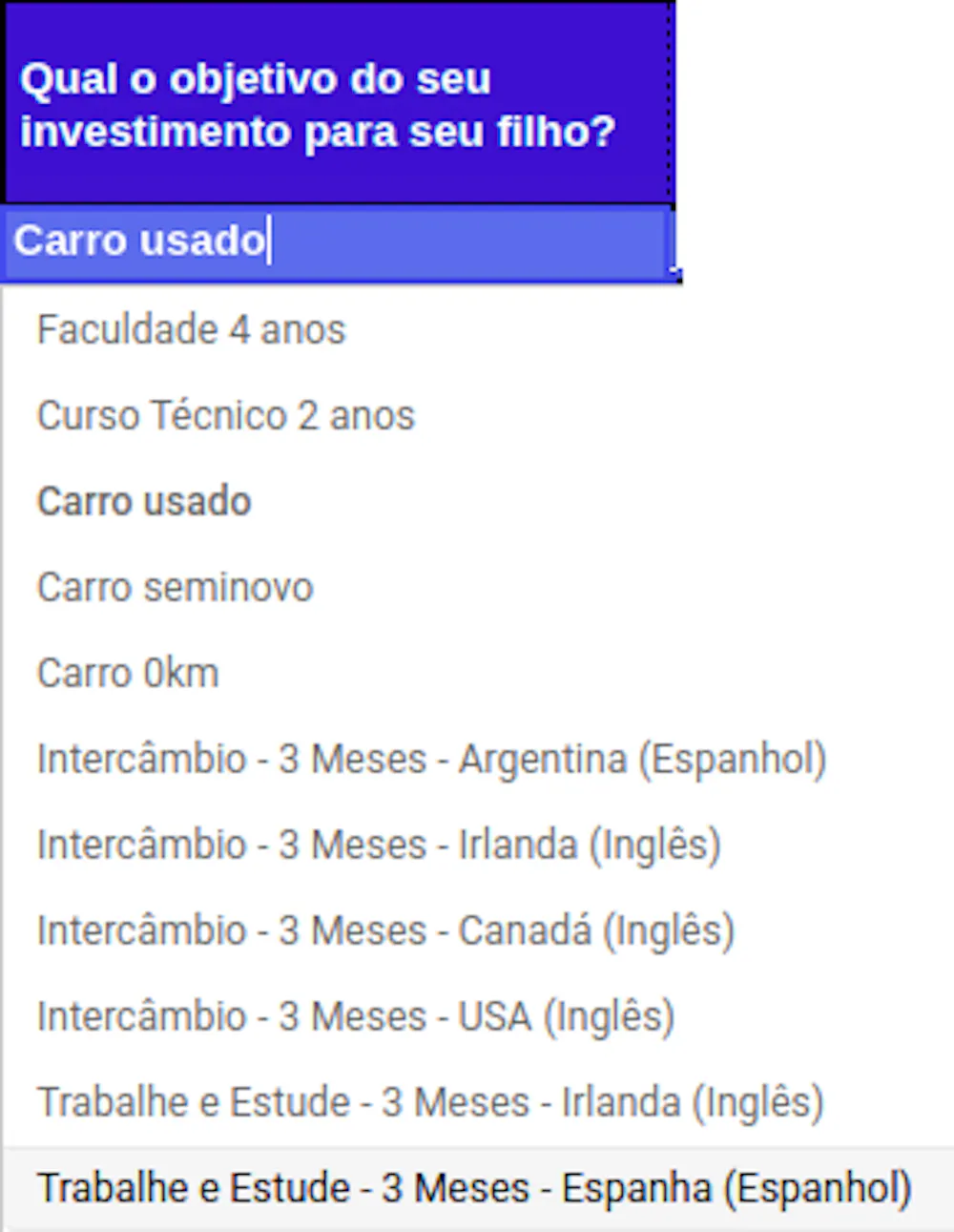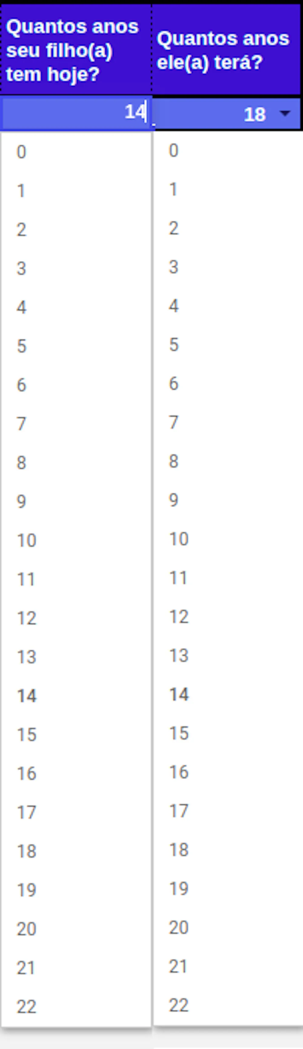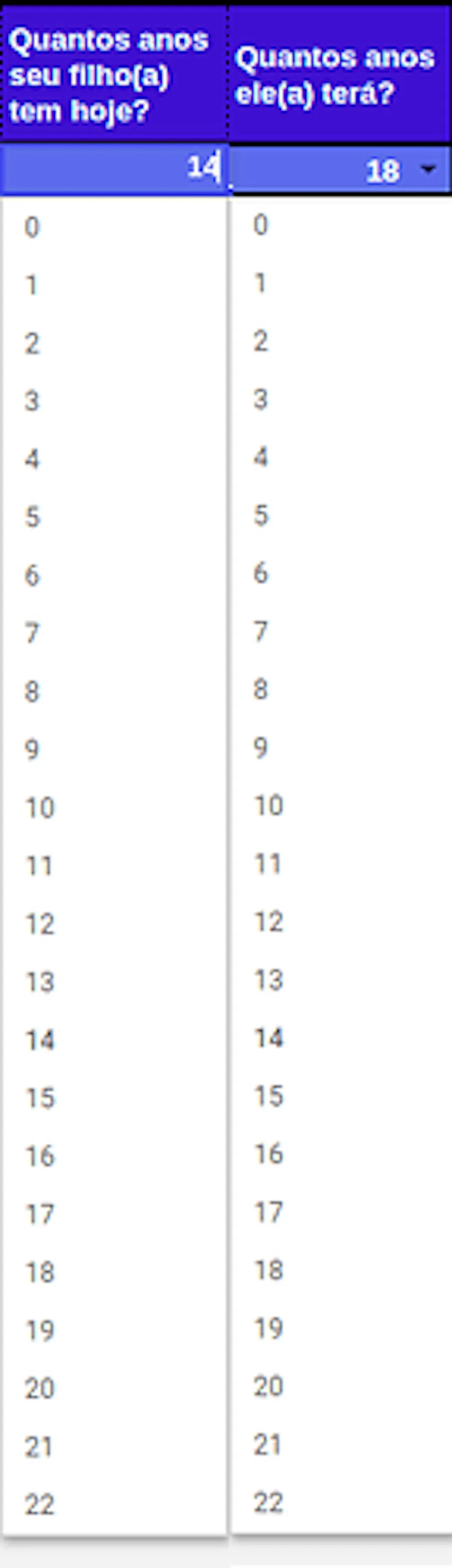 E aqui (foto abaixo) colocar a idade do seu filho hoje, e a idade dele quando você gostaria de conquistar esse objetivo (para sabermos quanto tempo de investimento você terá pela frente).
