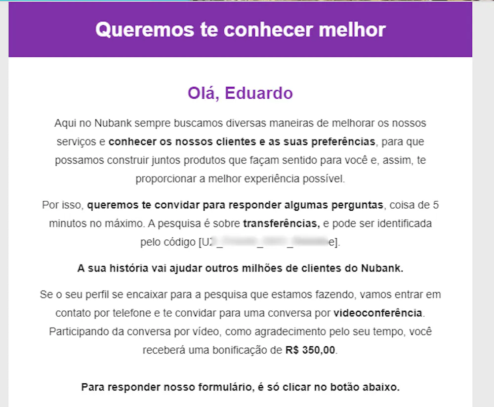 Informando que o meu perfil se encaixar para a pesquisa que estamos fazendo, vamos entrar em contato por telefone e te convidar para uma conversa por videoconferência. Participando da conversa por vídeo, como agradecimento pelo meu tempo, eu receberei uma bonificação de R$ 350,00.