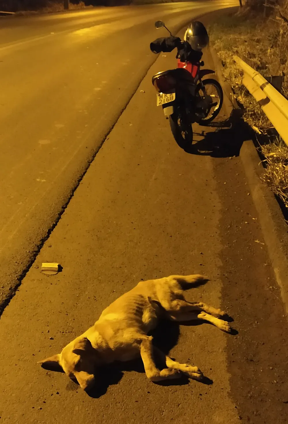 Quando passei com minha moto confesso que não achei que ele estava vivo, só parei pois quando cruzei por ele em um primeiro momento, a luz do farol de minha moto iluminou seus olhos, e isso ficou martelando em minha cabeça: “Como ele pode estar sem vida e ainda assim os olhos brilharem com a luz?” Nem sei se isso faz sentido, mas foi o que me fez voltar e verificar que realmente ainda existia vida ali, mesmo muito debilitado e completamente imóvel, mas ele estava vivo!