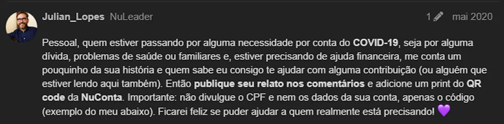 Em maio de 2020, estávamos em meio à pandemia de COVID-19 quando o @Julian_Lopes criou um t ópico (atualmente fechado) de ajuda para aqueles que enfretavam dificuldades. Mas além das ajudas financeiras, esse tópico também ajudou uma pessoa de forma muito especial, e você pode ler a história de Consegui um emprego por causa da NuCommunity lá no blog