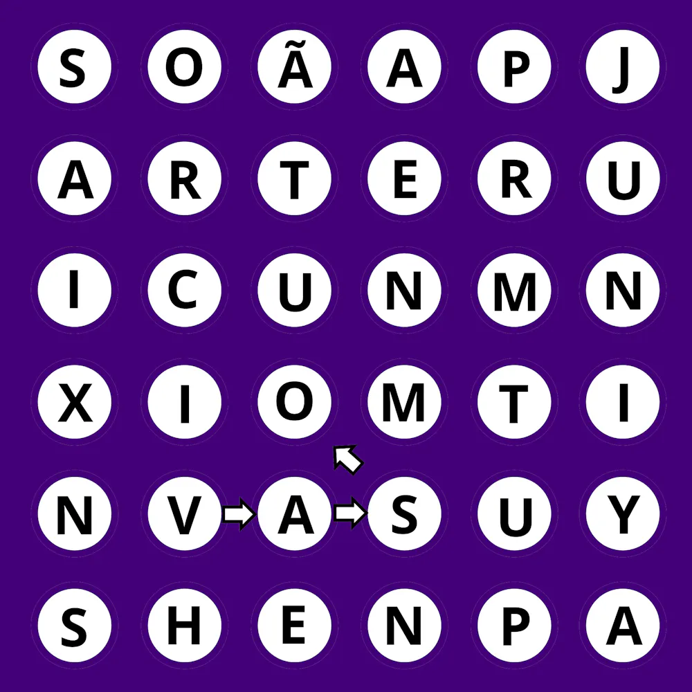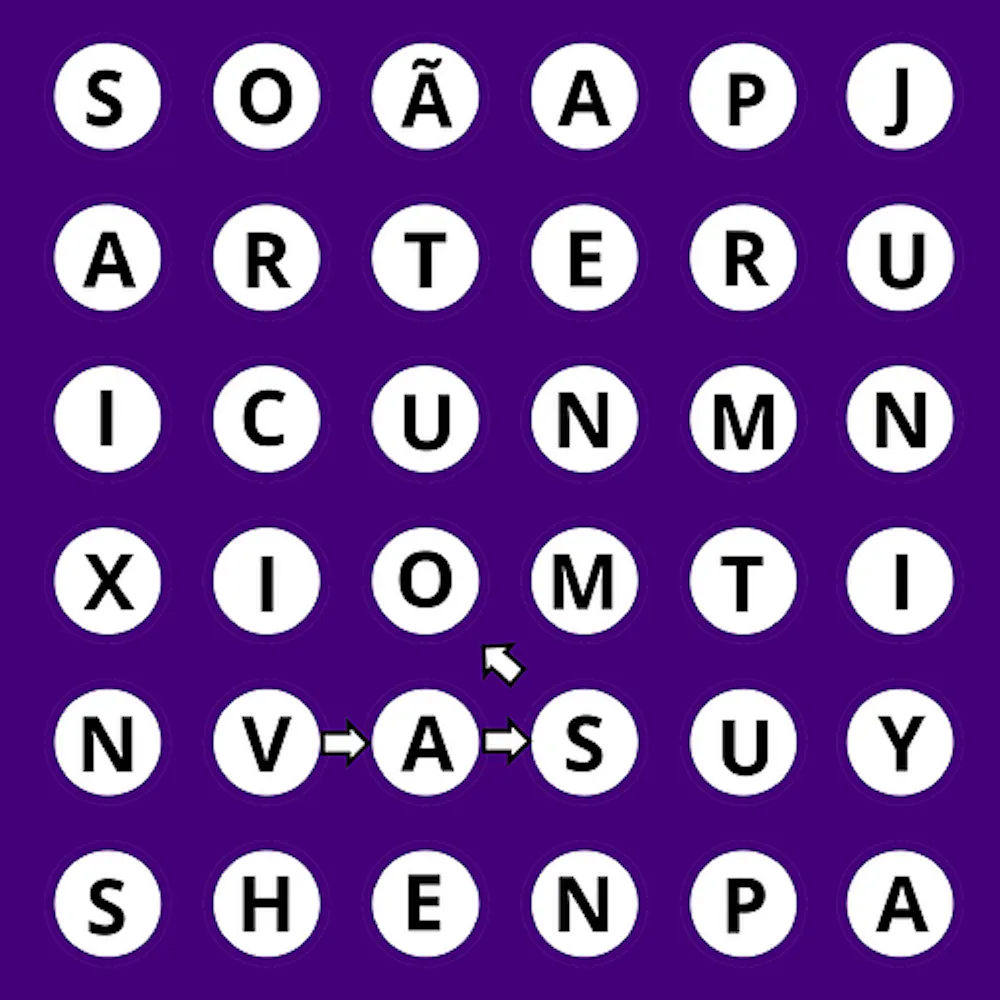 Regras: Só valem palavras de 4 letras ou mais. Você pode seguir em qualquer direção para formar palavras, mas não pode cruzar, pular nem usar a mesma letra mais de uma vez. No exemplo, foi formada a palavra VASO.