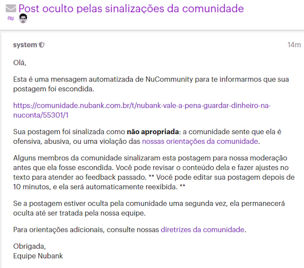 Postei aqui na comunidade um vídeo onde uma pessoa MOSTRA que VALE Á PENA ter o dinheiro na NU conta, e pelo fato do vídeo ser longo demais, alguém com preguiça de assistir o video todo, apenas marcou como impróprio, vou avaliar se compensa continuar nessa comunidade.