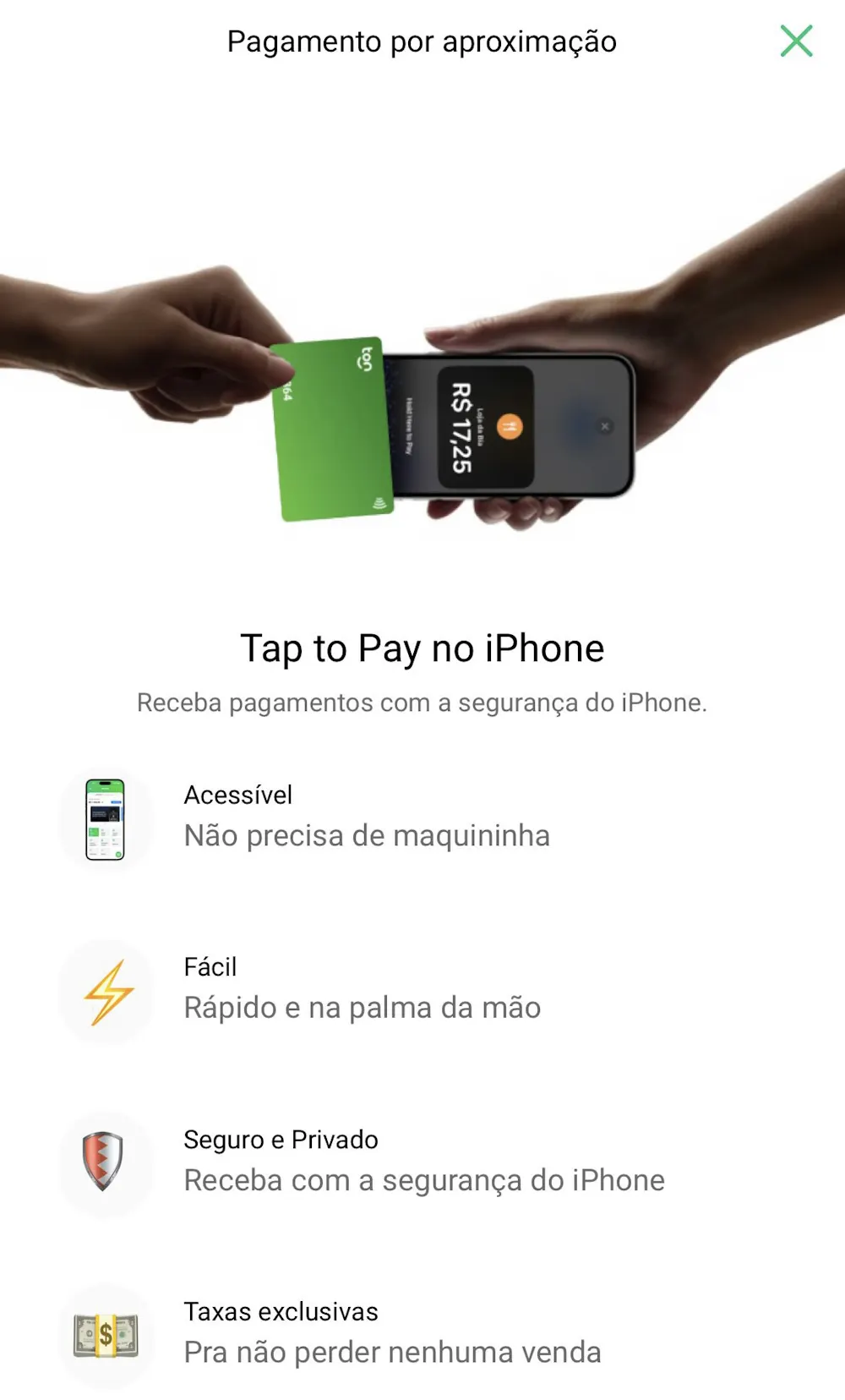Hoje o aplicativo TON da empresa de maquininhas que agora também virou uma conta de pagamento acabou de liberar a função TAP TO PAY que transforma o iPhone em uma maquininha para qualquer um dos seus usuários, inclusive os com conta PF para poderem fazer cobranças ou vendas à pessoas pelo cartão de crédito, ou por aproximação do smartphone deles