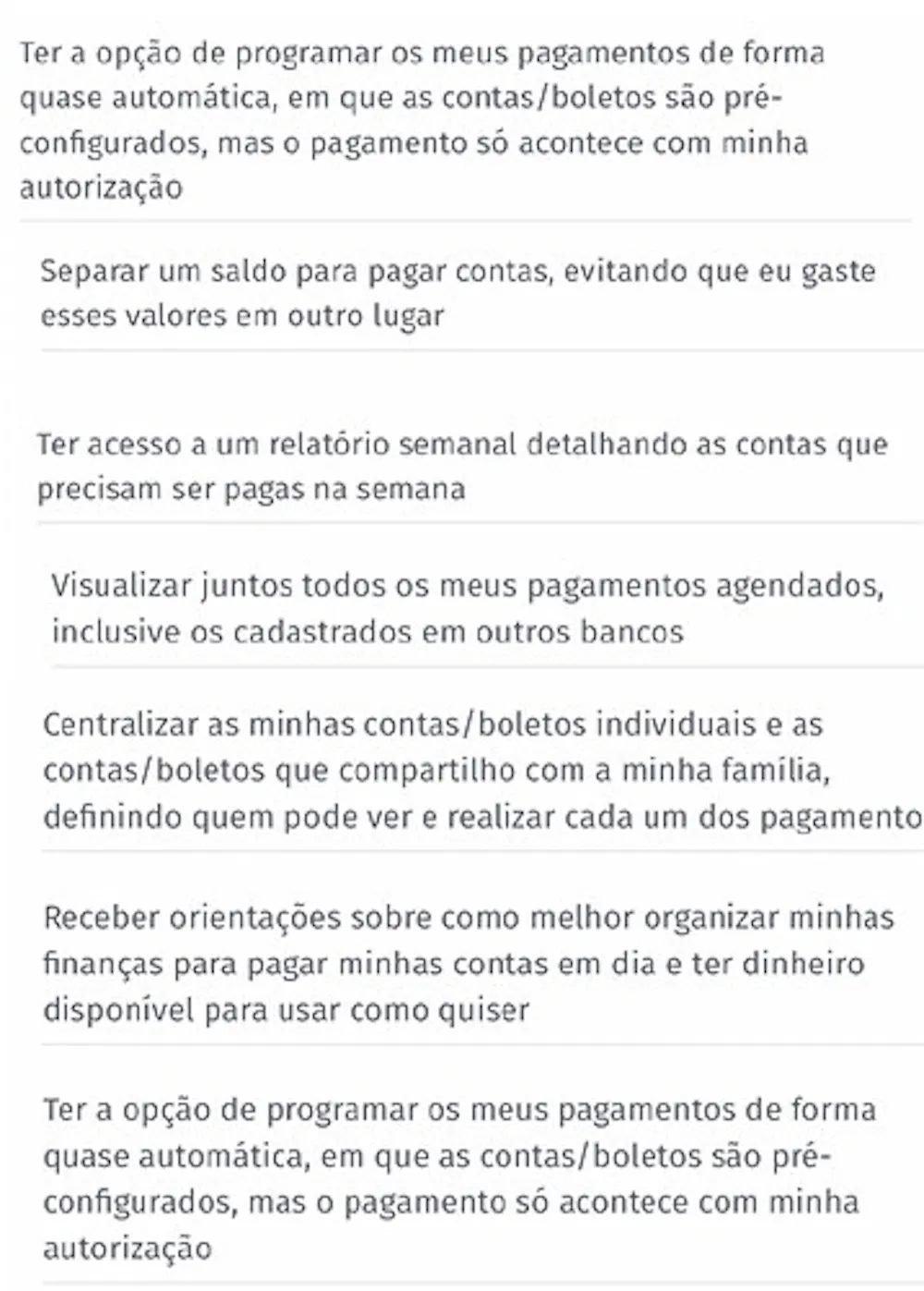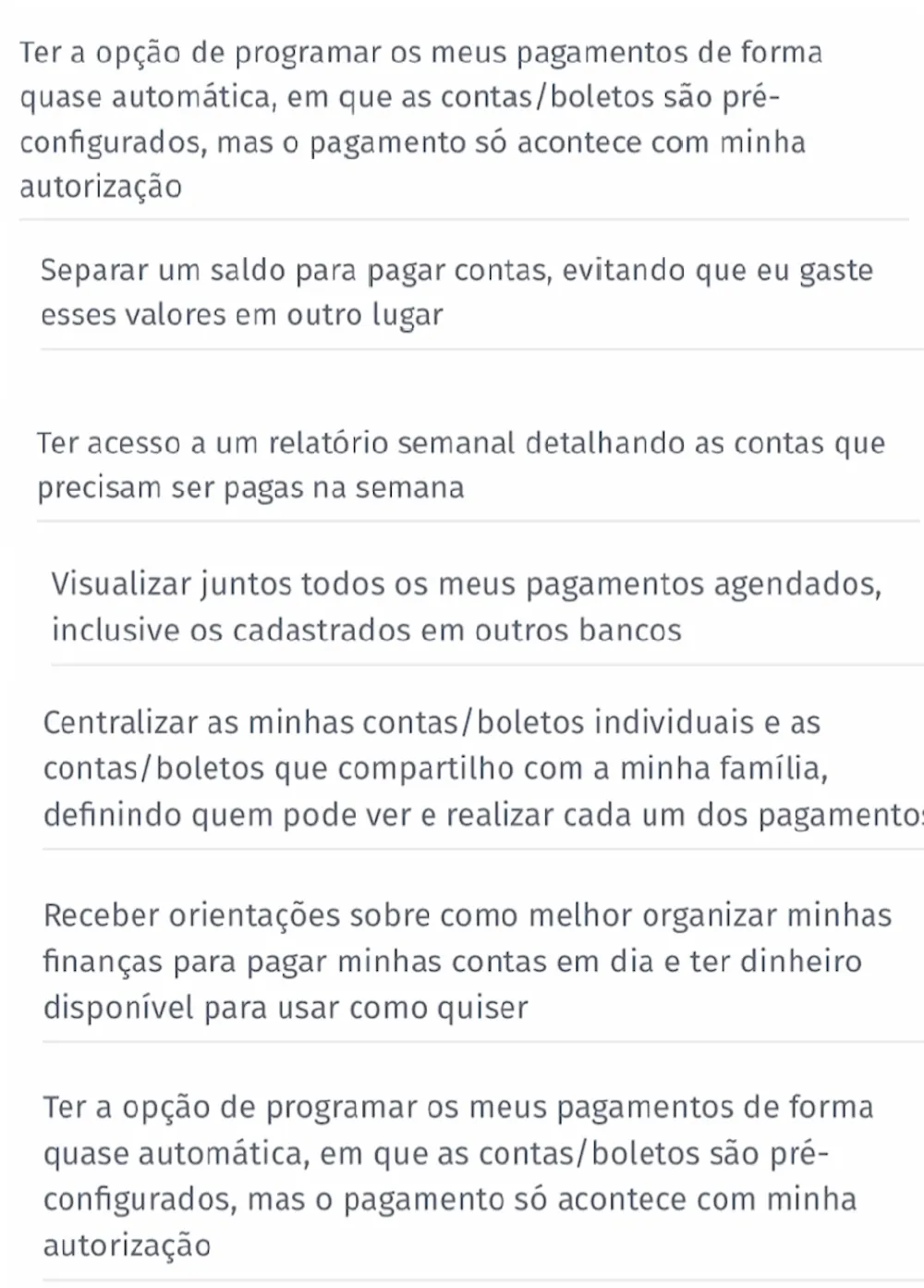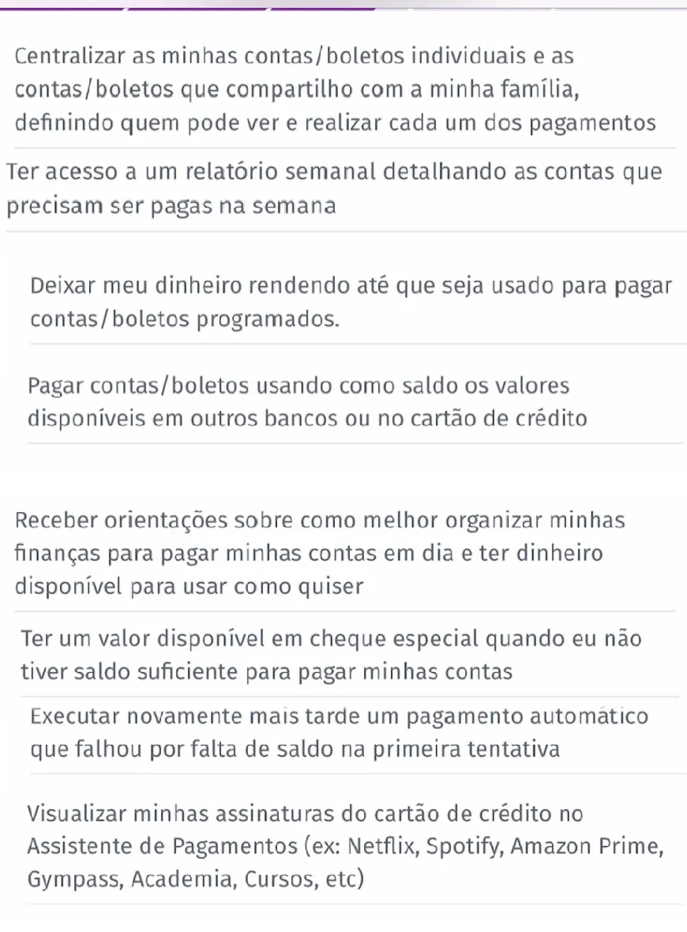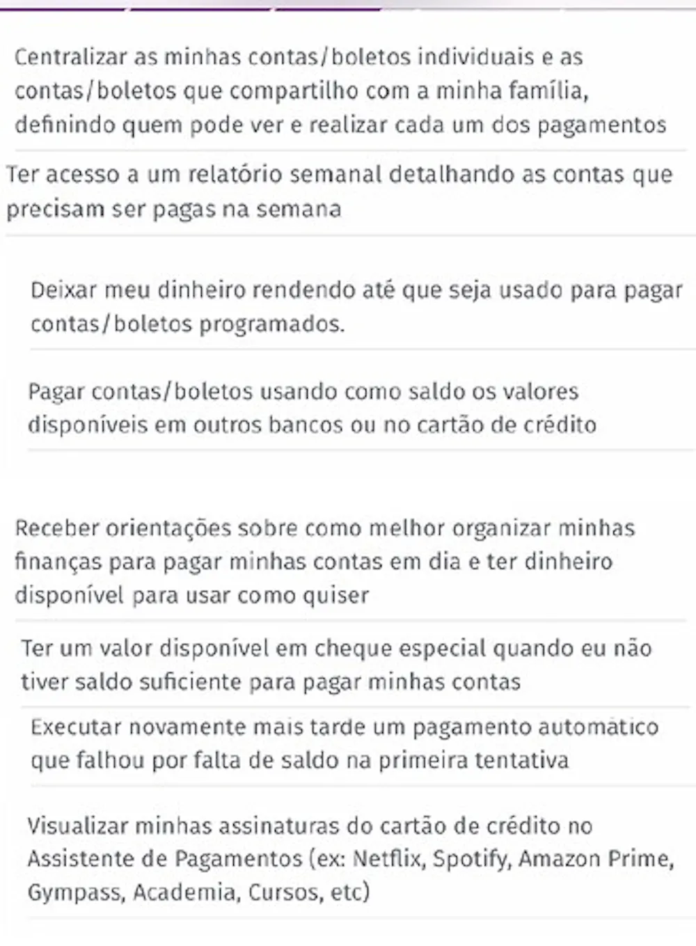 Recebi no meu e-mail um pedido para participar de uma pesquisa sobre o assistente de pagamentos do app do Nubank e nela podemos ver algumas funcionalidades que o nubank está querendo saber se é útil para nós. Então parece que vamos ganhar algumas delas