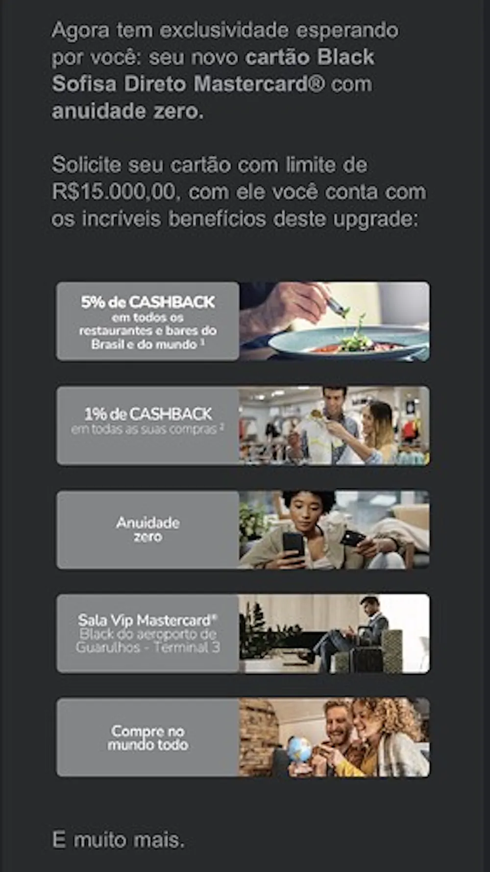 Olha só este da Sofisa sem anuidade, oferece 1% em qualquer compra, 5% de cashback em restaurantes e bares DO MUNDO e na conta tem até um CDB de 110% com liquidez diária.