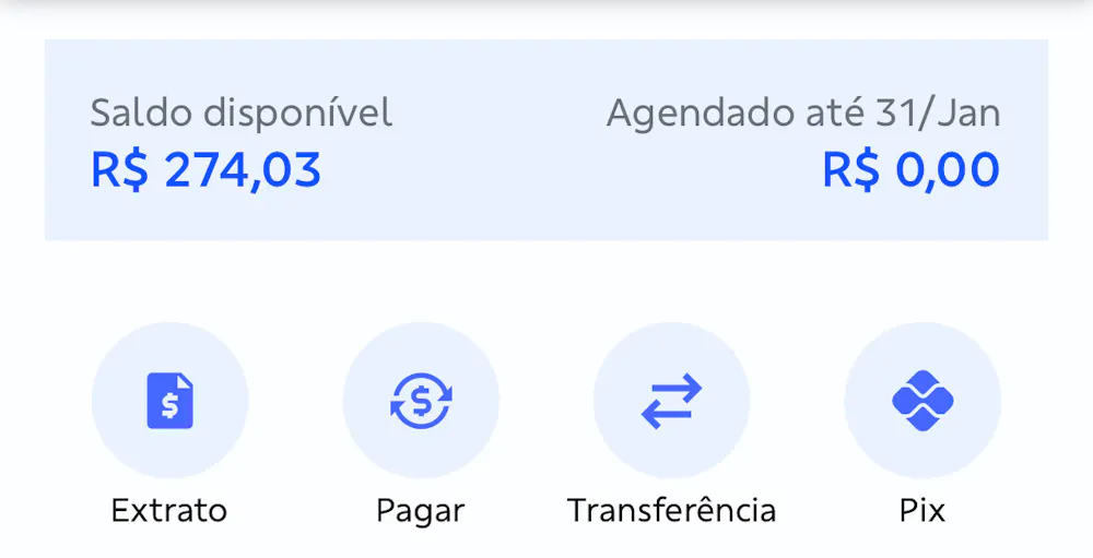 O banco tradicional amarelinho, tem uma funçãozinha interessante. Fica bem claro no saldo, quanto esta comprometido com compras agendadas. Isso facilita muito para entender quanto do saldo está de fato disponível para uso, sem comprometer as contas agendadas.