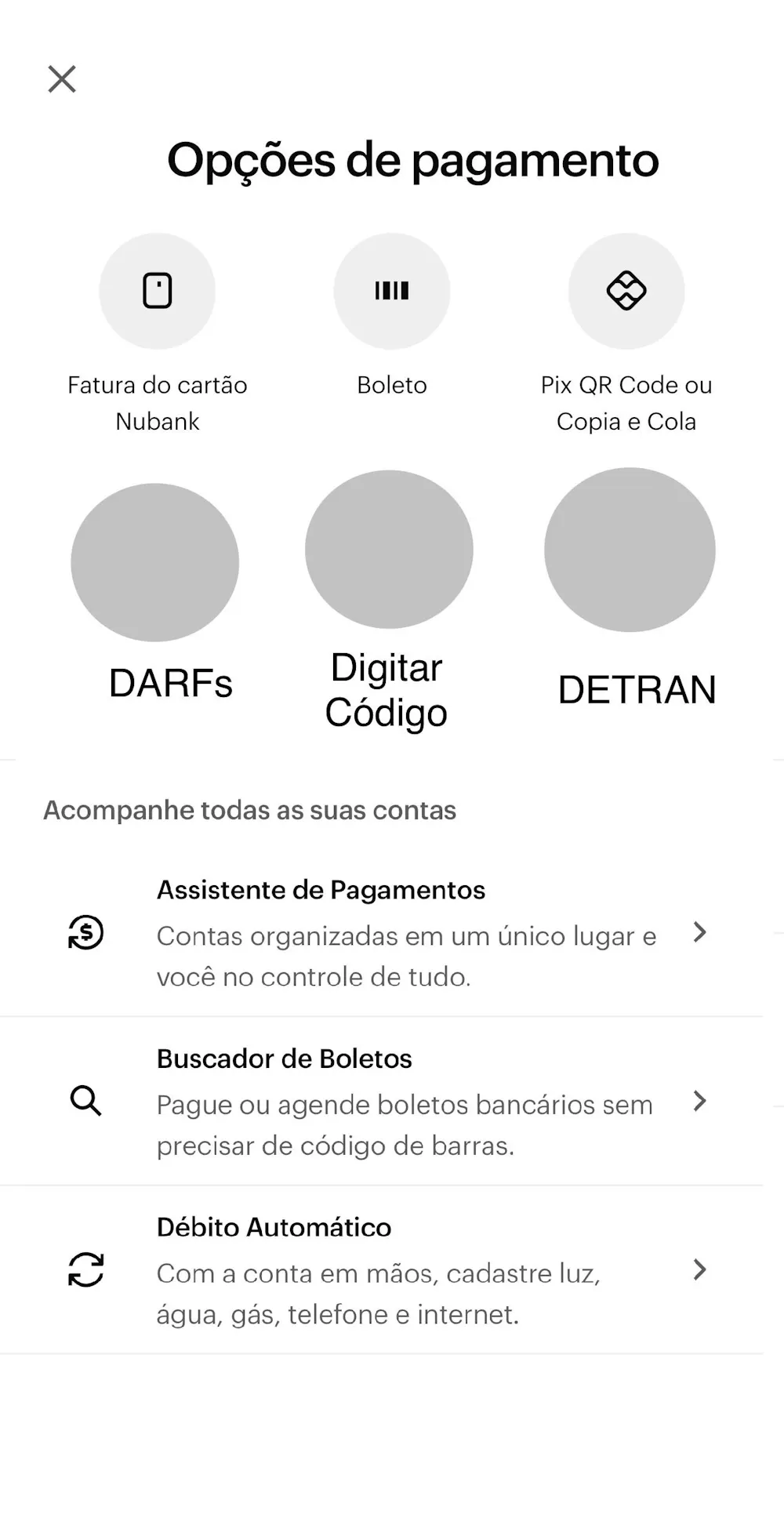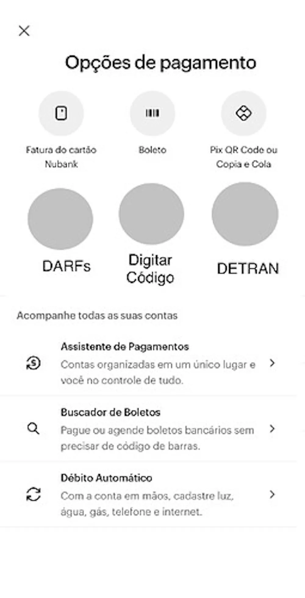 Quando a gente vai pagar um boleto no Nubank normalmente tocamos no no botão chamado PAGAR da página inicial, depois na próxima página que abre temos apenas 3 opções, 3 botões. Um é para pagar com Pix copia e cola, outro botão é para pagar a fatura do cartão e outro e pagar boletos né. Mas acho que vocês do Nubank poderiam melhorar esta área né, pois está faltando botão com função para pagar DARFs que não possuem código de barras e botão para pagar boletos apenas digitando o código de barras de forma direta sem precisar scannear.