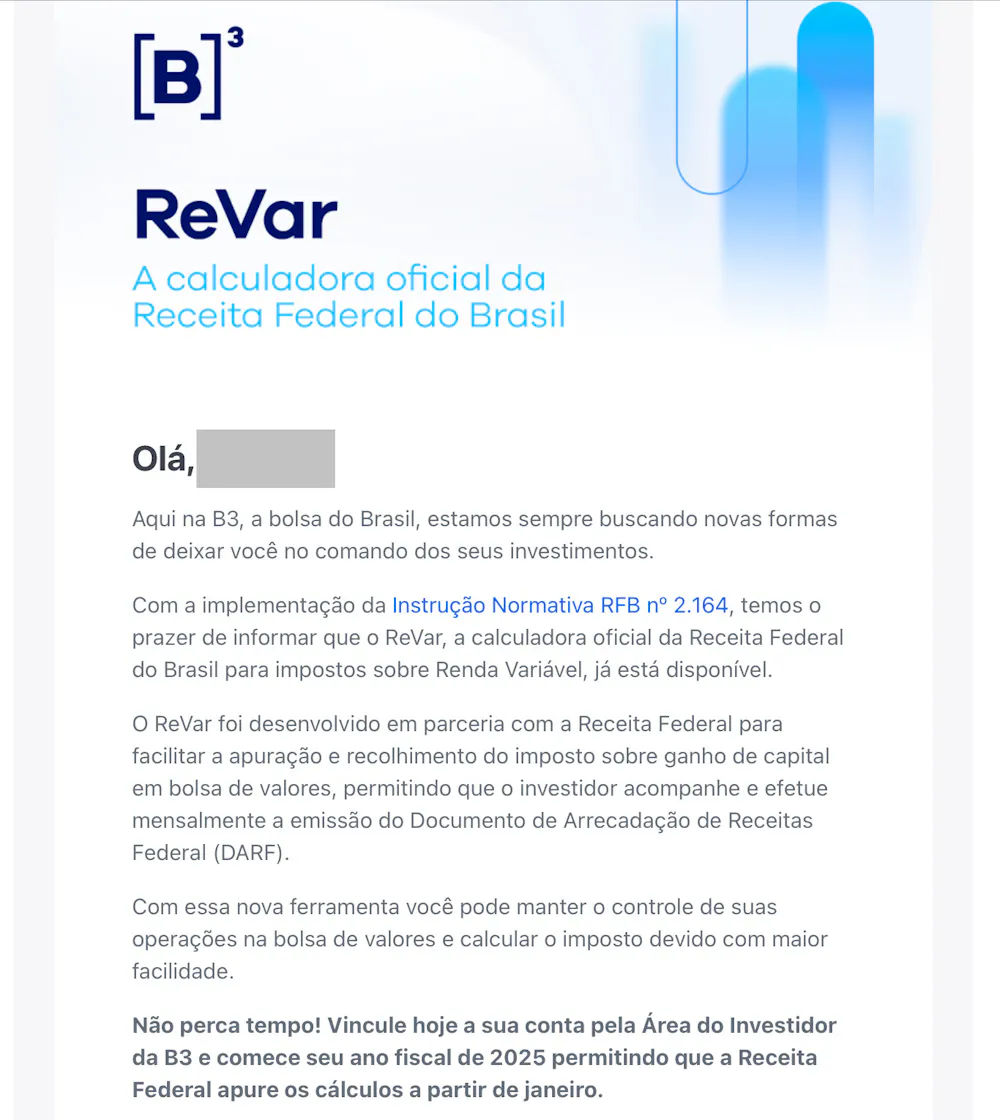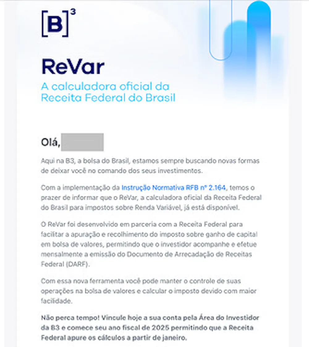 Isso porque após vincular sua conta da B3 com o ReVar no site do eCAC da receita os dados das suas movimentações na B3 são repassamos para o ReVar e preenchidos. Cálculos de compensações de perdas, corretagens e eventos também serão considerados para gerar o DARF.