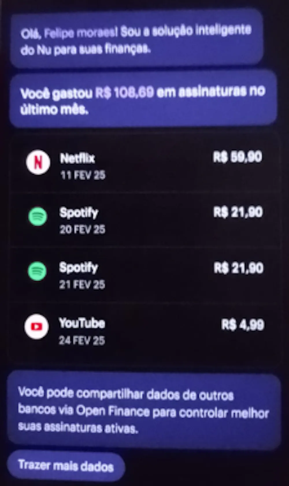 Quando a IA me manda um relatório sobre as ‘‘minhas’’ assinaturas, no final não são apenas ‘‘minhas’’ por mais que eu seja responsável pelo pagamento delas. Porém eu não tenho a visão do que é em relação ao Cartão Adicional e o que é em relação ao Meu Cartão, e não só aqui, em muitas outras partes o Aplicativo meio que ‘‘desconsidera’’ a existência do Cartão Adicional.