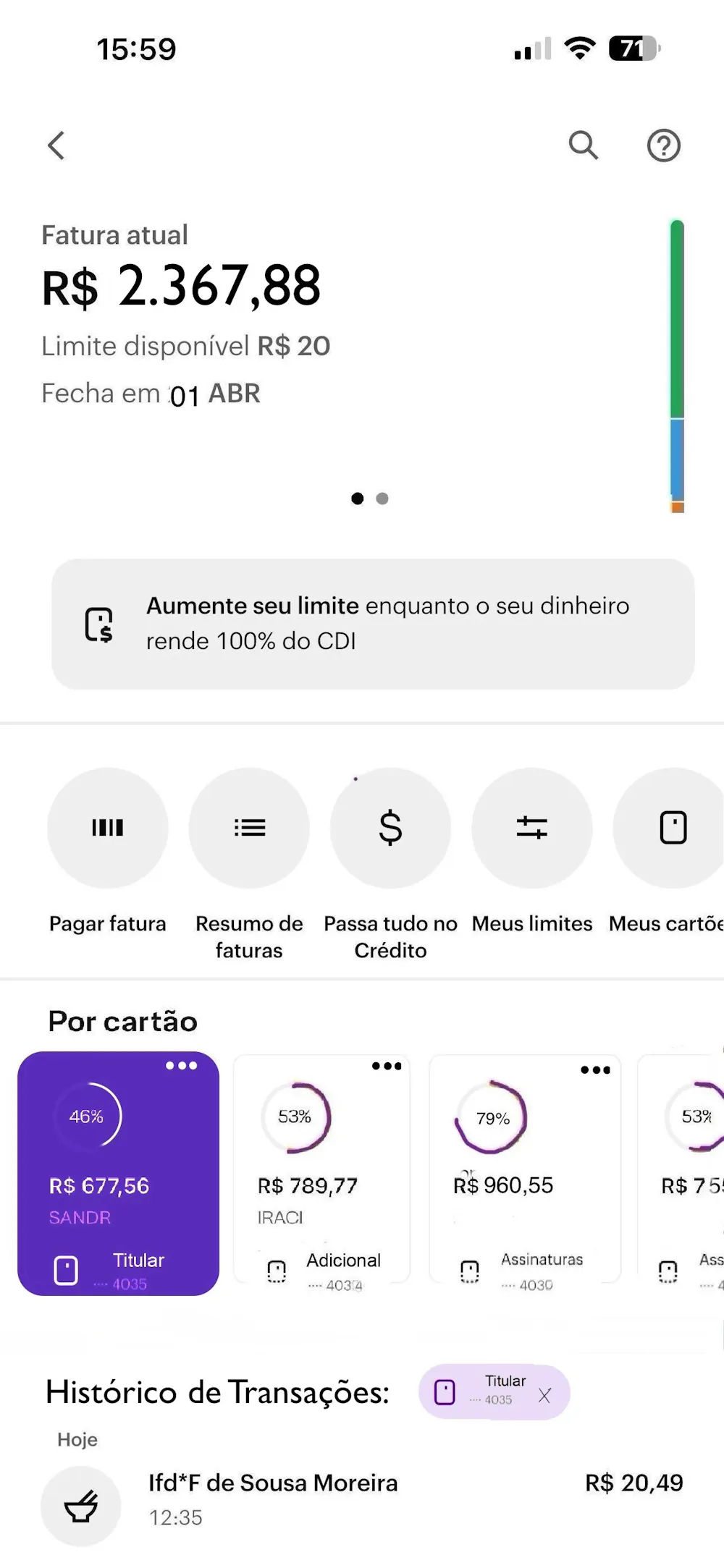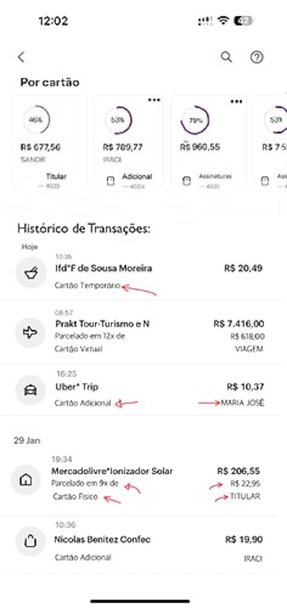 Além disso, estes cards poderiam servir como filtros para visualização do histórico de transações tbm. Assim quando o cliente tocar em algum deles o histórico mostra os gastos daquele cartão em específico.