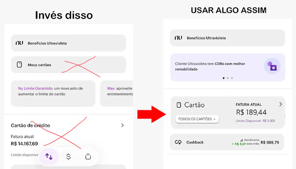 Meus queridos Nubankers responsáveis pela área de Cartões do App, venho aqui dar algumas sugestões de melhorias para a área de Cartões no App do Nubank que na minha opção poderia trazer mais clareza, organização e eficiência com acesso rápido a algumas funções e consultas que os clientes geralmente precisam.