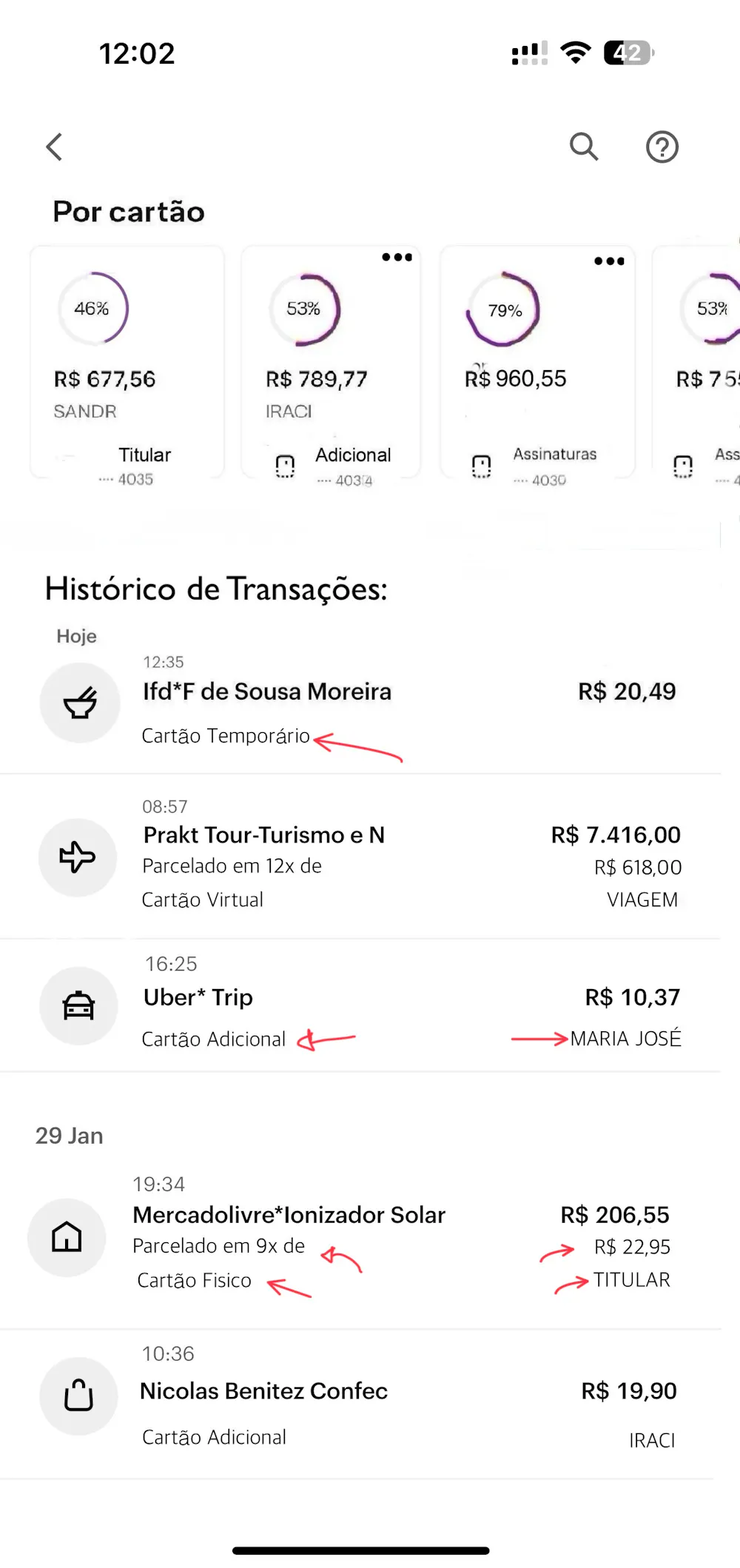 Aproveitando eu também gostaria de sugerir alguns pequenos ajustes no registro do histórico de transações dos cartões lá no app, como neste exemplo abaixo: