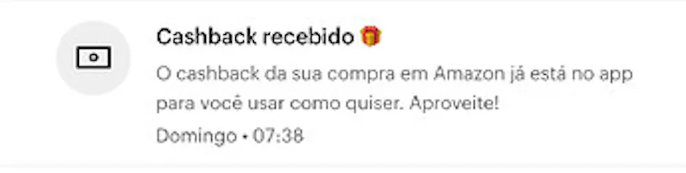 Outra notificação que eu acho que precisa de melhoria é a do shopping Nu sobre os cashbacks. O app também não mostra qual valor que foi liberado. Acho que seria mais prático mostrar informando ao cliente tbm!