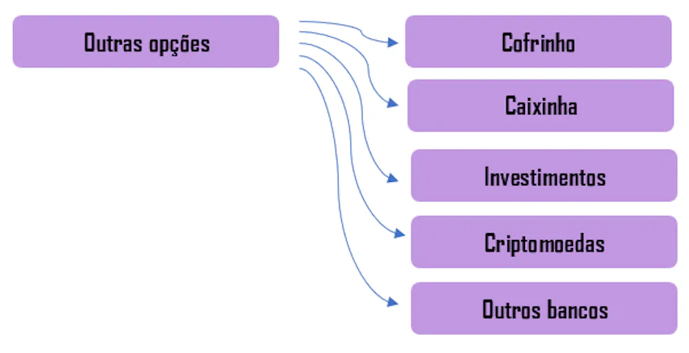 Em se tratando de investimentos e criptomoedas se faz necessário uma etapa adicional para que o cliente possa escolher quais investimentos ou criptomoedas deseja se desfazer, a preço de mercado, para pagamento da fatura. Em se tratando de outros bancos (open finance), o cliente deveria selecionar a entidade bancária em uma lista e ser direcionado ao respectivo app, onde digitaria a senha para autorizar a transação.