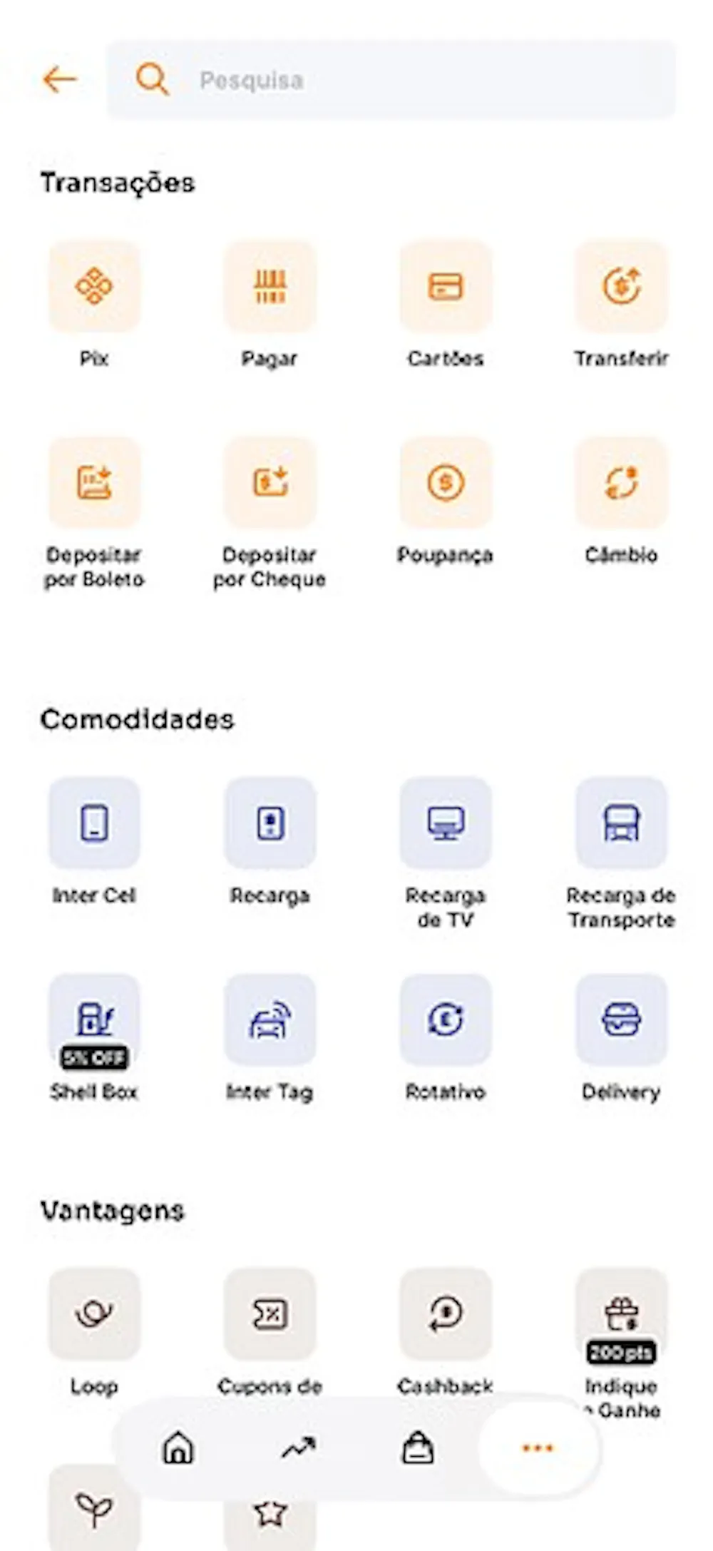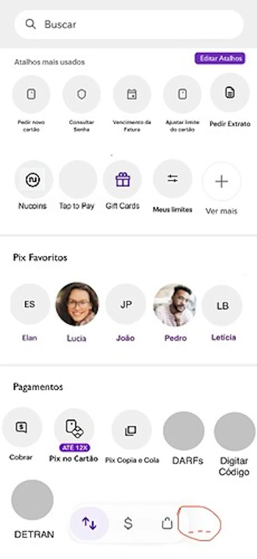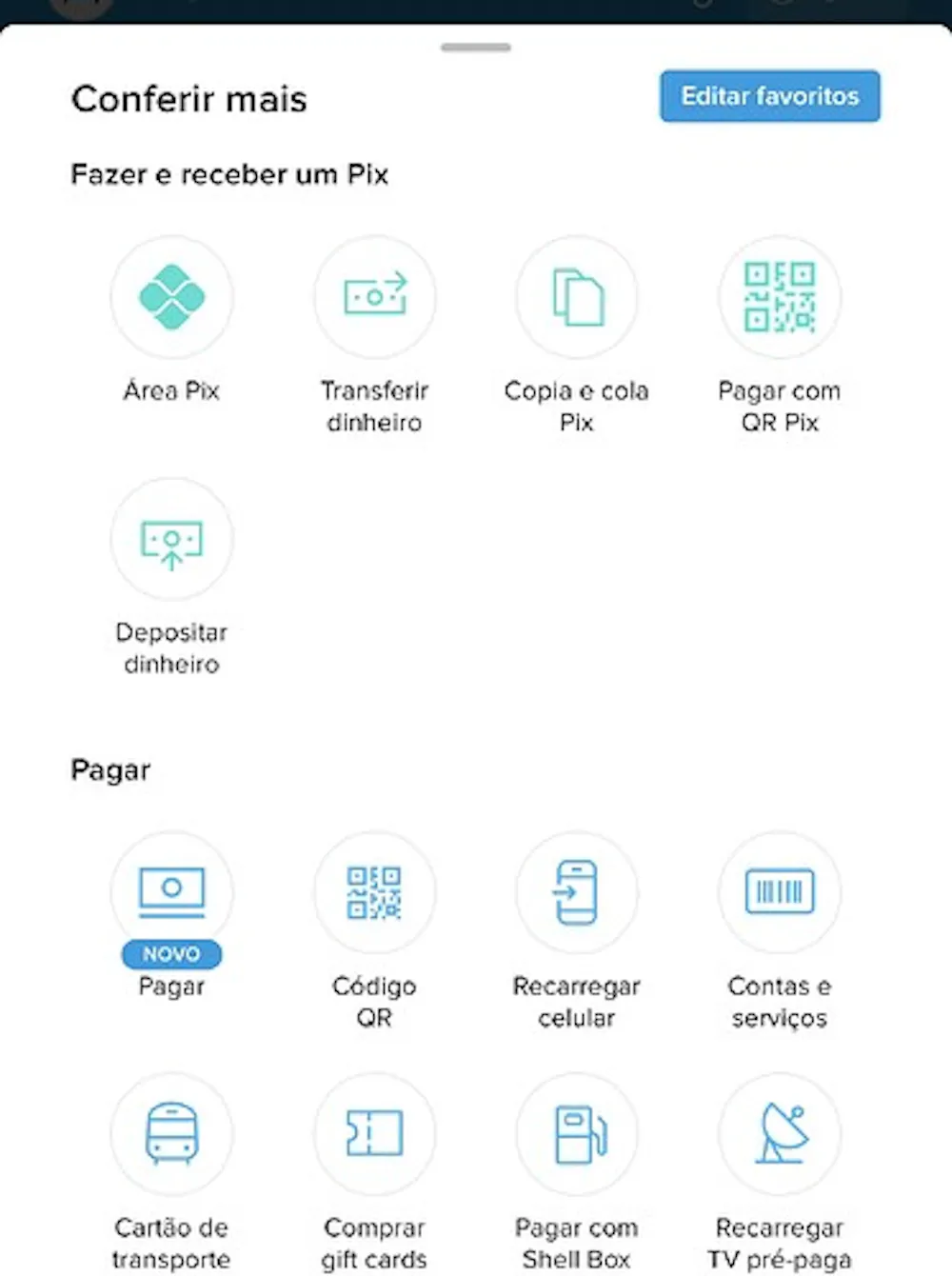 Assim como nesta nova página colocar outras sessões com atalhos rápidos de funcionalidades do aplicativo como uma área com contatos favoritos para pix definidos pelo cliente, área com atalhos de funções para pagamentos, outra área com atalhos de benefícios, de seguros, área com funções voltadas para transações e etc. parecido com o MercadoPago possui e que um outro banco atualizou ontem e está oferecendo isso. Até o PicPay está oferecendo uma página com atalhos rápidos. Cada um ao seu estilo