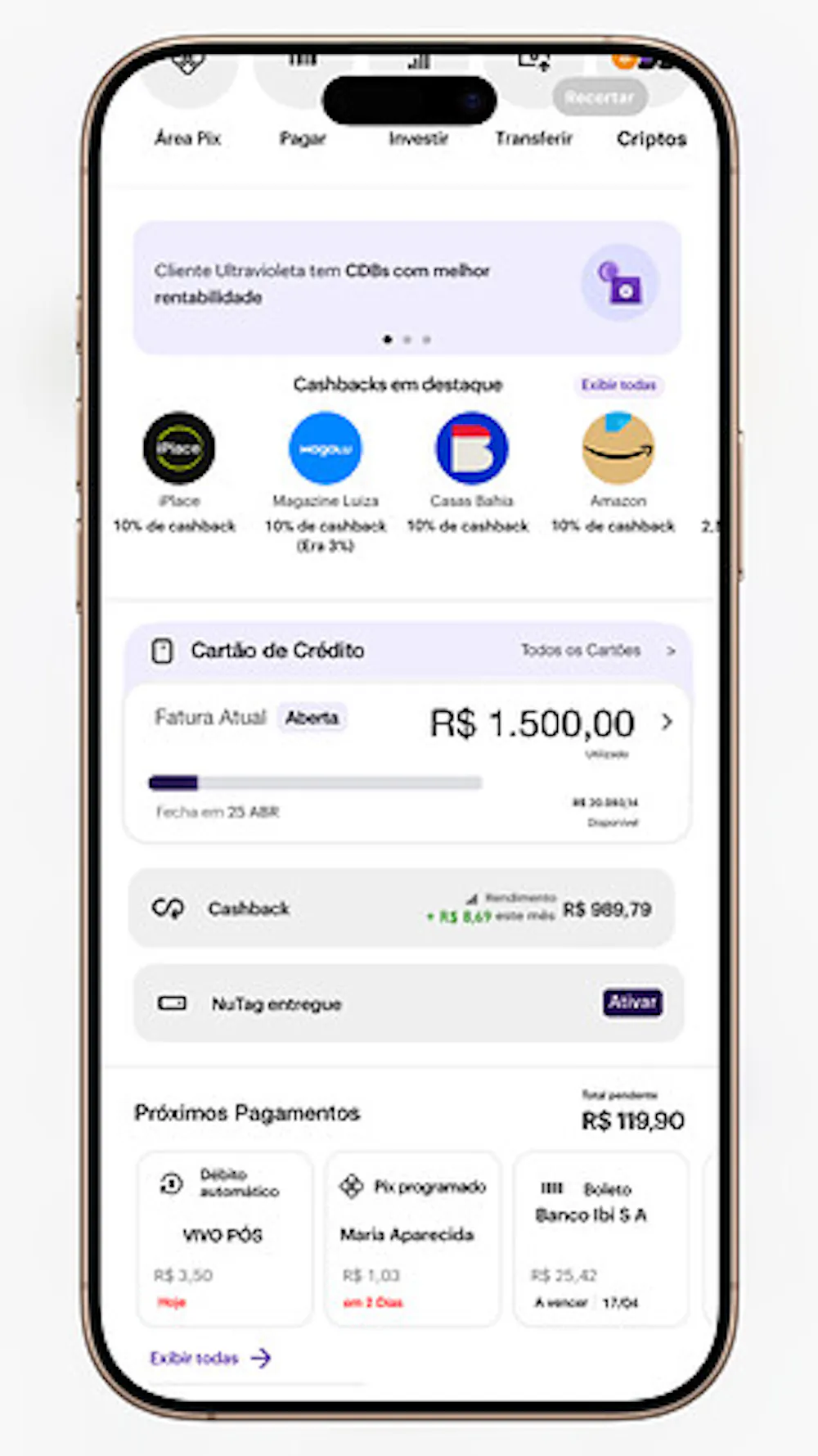 Seguindo a tendência do mercado, sugiro o Nubank trazer uma IA de verdade ao app. Então transformei a barra do pix por voz em uma IA, colocando logo após a informação do saldo em conta na página inicial, assim o cliente ao abrir o app já conseguiria fazer um pix por voz, fazer buscas de funções ou áreas no app, anexar boletos e pdfs, inclusive imagens com chave pix p/ reconhecimento e assim gerando opção p/ o cliente pagar.
