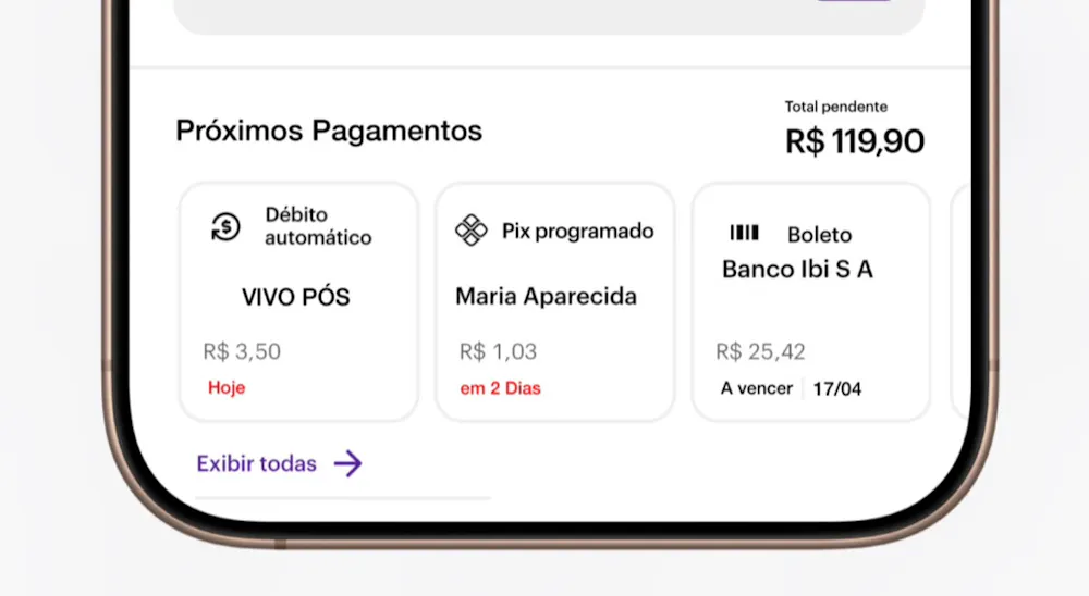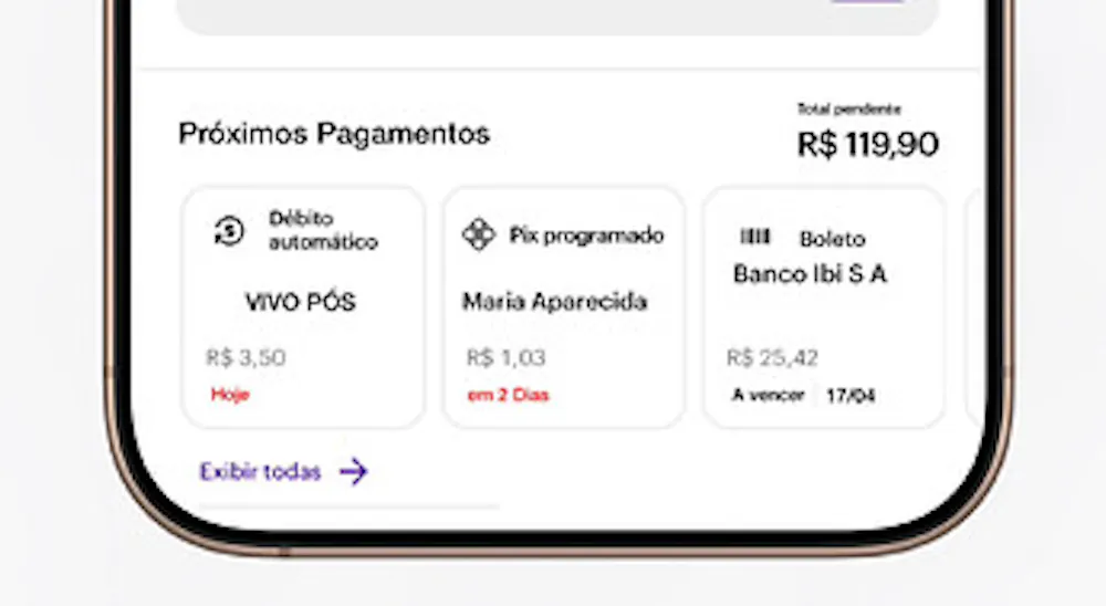 Por fim, para a sessão de Próximos Pagamentos que já temos no app, minha idéia seria uma reformulação total, com um novo layout em formato de cartões, dessa forma seria possível ver na home mesmo quais são as próximas transações programadas na conta do cliente, inclusive indicando o valor pendente que falta na conta p/ poder quitar todos os próximos pagamentos dos 5 dias a seguir.
