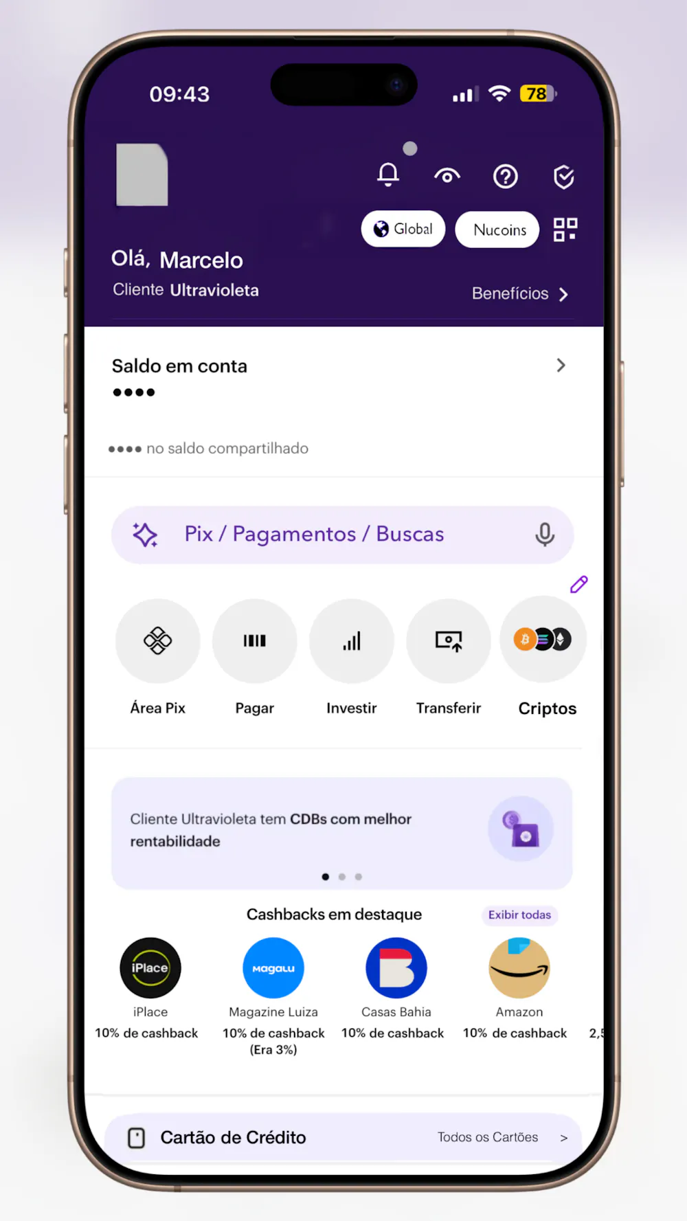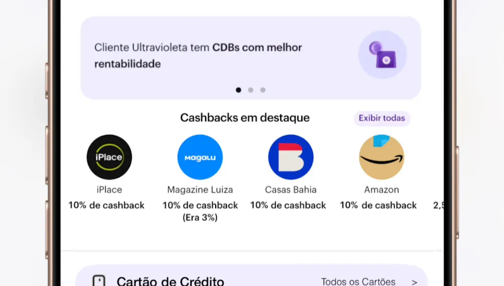 Logo abaixo continuamos com o card de propaganda do nubank que já temos atualmente, mas seguindo de uma nova sessão com promoções do shopping Nu. Onde serviria p/ mostrar as lojas parceiras com melhores cashback do dia, assim como gift cards.
