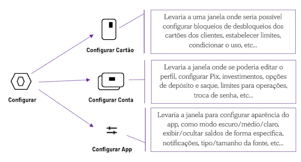 Tratando particularmente do menu configurar, creio que ele, como outras funcionalidades devem ser disponibilizados de modo simples para os usuários do aplicativo. Divido em submenus mais específicos e assim por diante. Confira na imagem abaixo uma sugestão de como ficariam distribuídas essas funcionalidades na tela de perfil, visando uma compreensão mais intuitiva por parte do usuário.