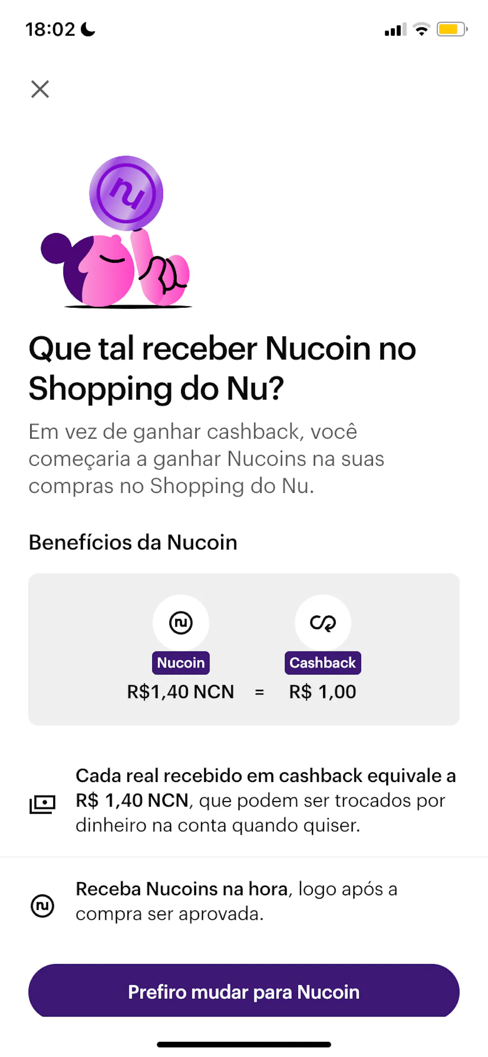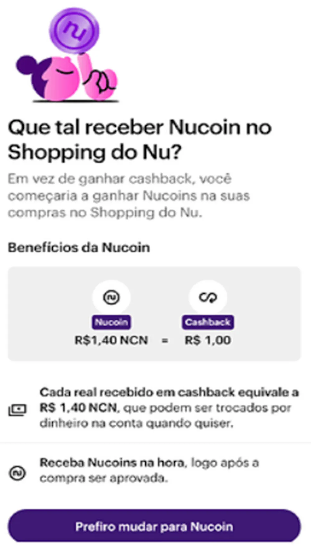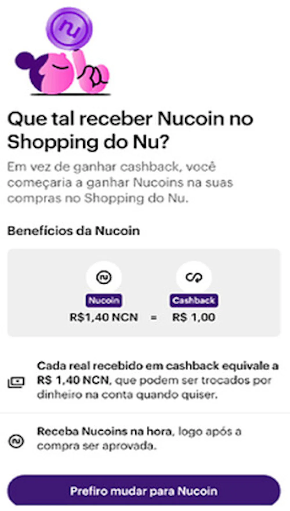 Conforme publicação do amigo @RadCaio que causou um certo rebu na comunidade com o lançamento de uma nova promoção no NuShopping, onde conforme se pode ver na imagem abaixo são ofertadas as possibilidades de trocar cashback por cashcoin, com adicional de 40%, caso o cliente opte pelo segundo benefício.