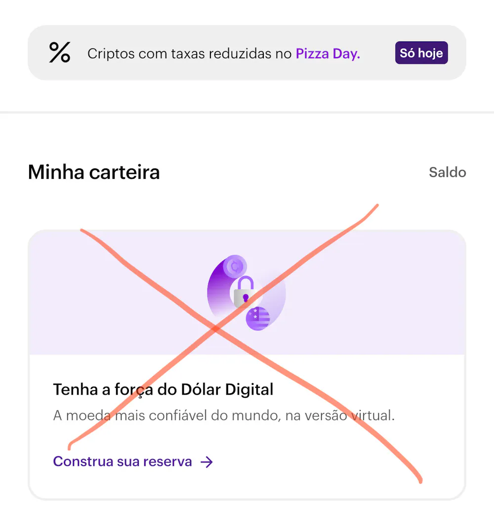 Ah, eu também gostaria que o Nubank nos dê opção de desativar este card enorme do dólar digital da nossa carteira de cripto. É muito ruim pra ver minha carteira ali na página inicial.