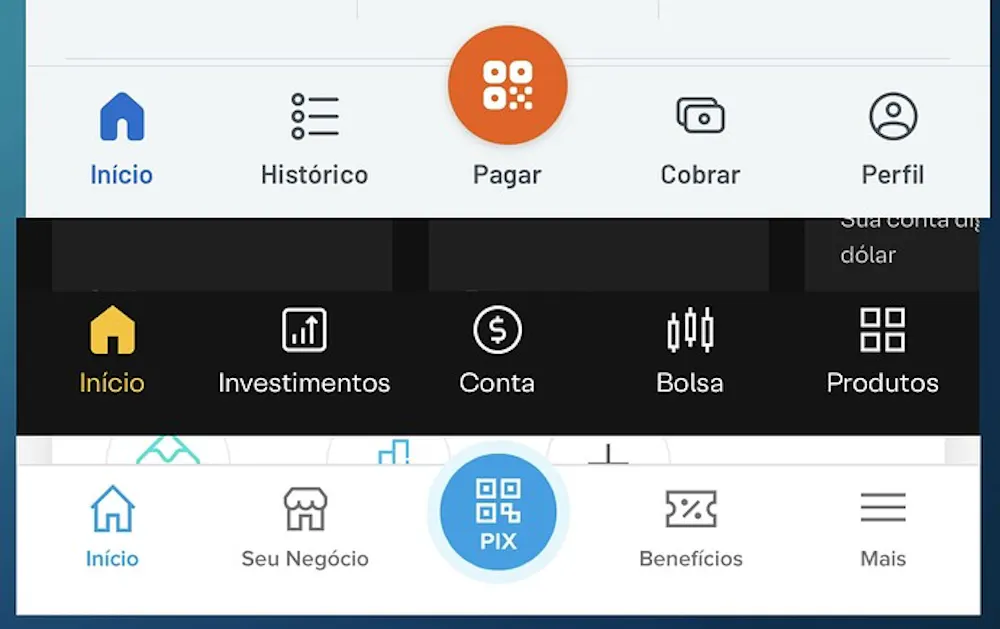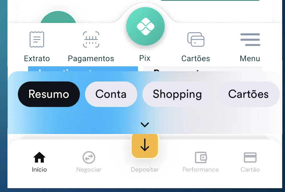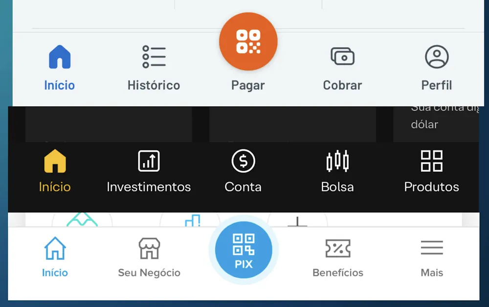 Além de poucas opções ali, acho que da forma flutuante que está perdesse aproveitamento da página que poderia ter caso o Nubank adotasse a forma que várias outras contas estão disponibilizando, até 5 botões fixos na parte de baixo da home do app. Acho que isso traria mais praticidade no acesso e uso de funções do app para o dia a dia. Aqui 6 exemplo de alguns apps que o Nubank poderia se inspirar.