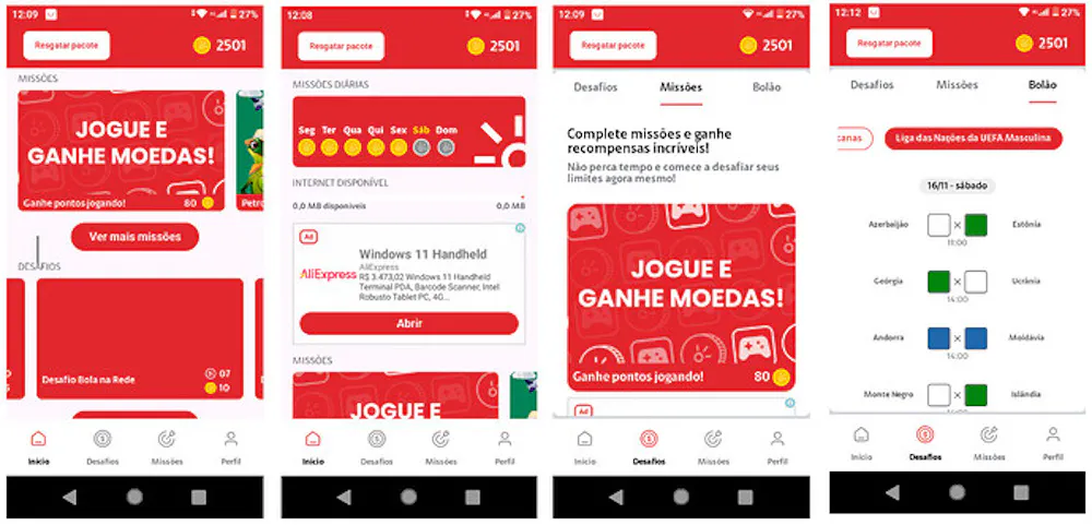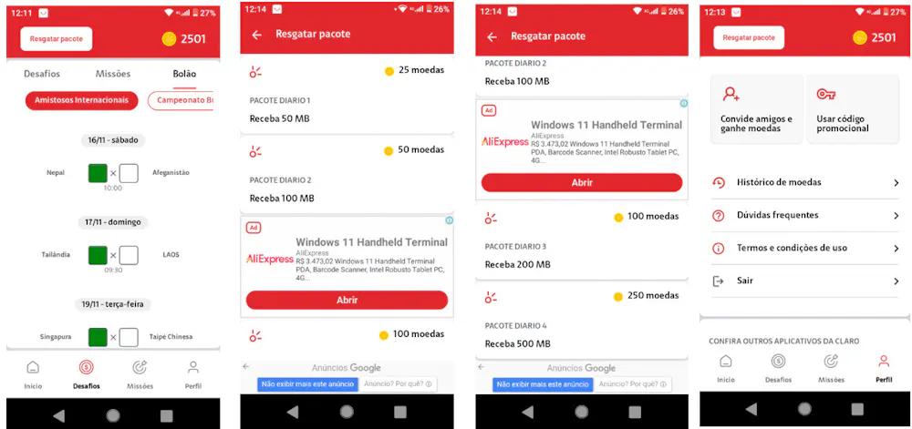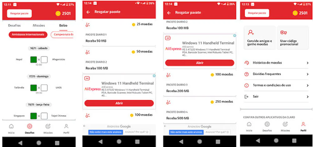 Vale ressaltar que as moedas caem imediatamente após a realização de cada tarefa e elas podem ser trocadas por pacotes de internet de 50 a 500 MB (relação de uma moeda para cada 2 MB). A troca deve ser efetuada clicando no botão “resgatar pacote”, na barra superior da tela, e os pacotes têm validade de um dia, ou seja, só se deve trocar a quantidade que se pretende consumir em 24 horas.