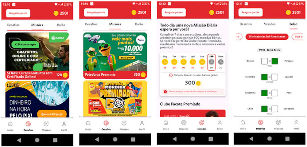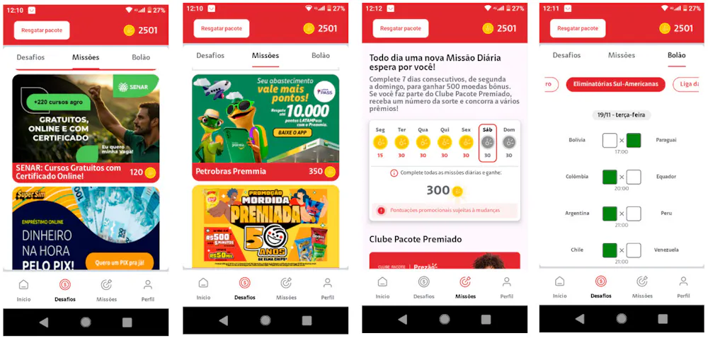 Na seção Bolão do app Prezão da Claro o cliente encontra várias partidas de futebol de times e seleções divididas em grandes competições nacionais e internacionais, nas quais ele pode apostar na vitória de uma das equipes ou no empate. Cada acerto lhe dá o direito a determinada quantidade de moedas virtuais da Claro.