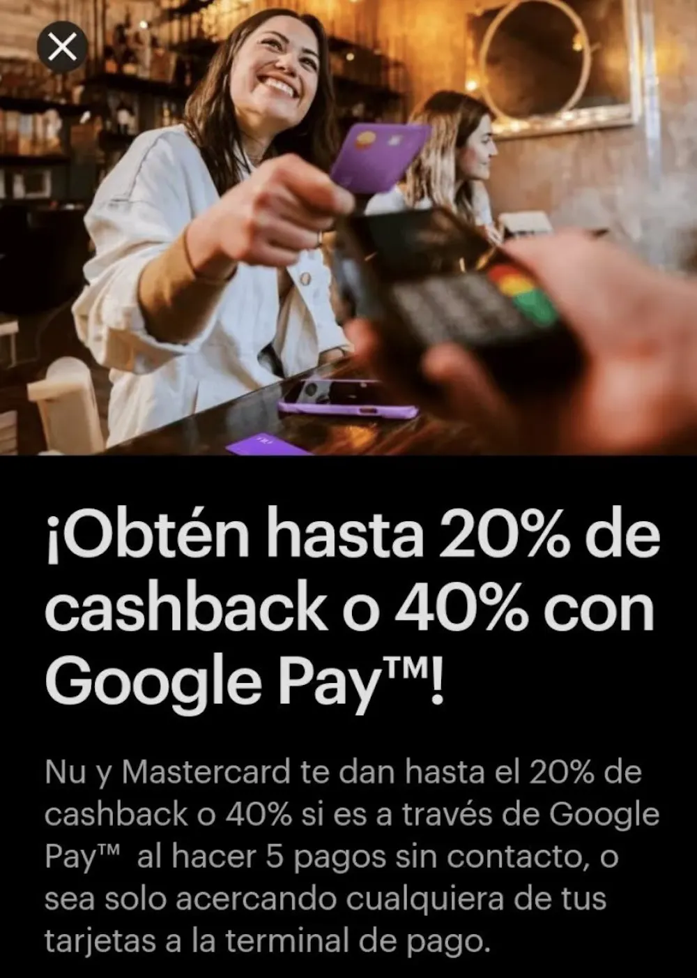 Super promoção do Nubank com a Mastercard oferecendo até 40% de cashback para clientes que pagarem usando a aproximação. É 20% com qualquer carteira e 40% com o Google Pay no México