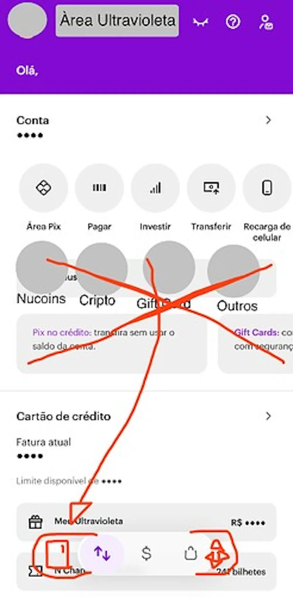 Algumas sugestões na minha opinião seria como neste print que tentei ilustrar hehe. Adicionar 2 botões extras de atalhos no menu flutuante para funções como serviços relacionados a cartão de crédito, botão do pix que abre a página de contatos favoritos e outras funções. Tirar aquela área com cards de propagandas e menu de cartões que poderia incluir no novo botão flutuante sobre cartões, adicionar mais botões de funções do aplicativo para acesso rápido ali naquele local, inclusive botão perto do perfil para acessar a área ultravioleta, e mais pra baixo da página incluir um card mostrando a cotação do nucoin e outras moedas como cripto, dólares e etc, com suas variações em tempo real, card mostrando o uso do limite do cartão e outros serviços.