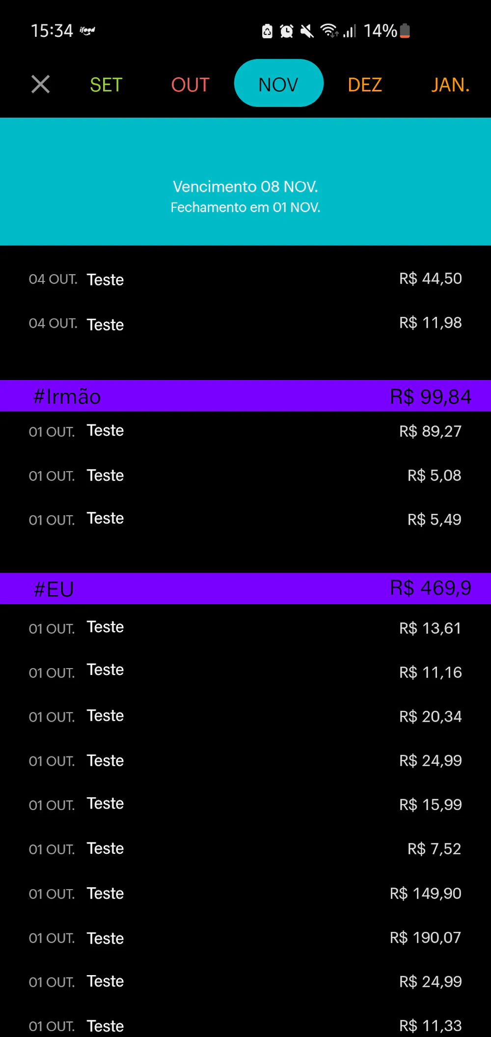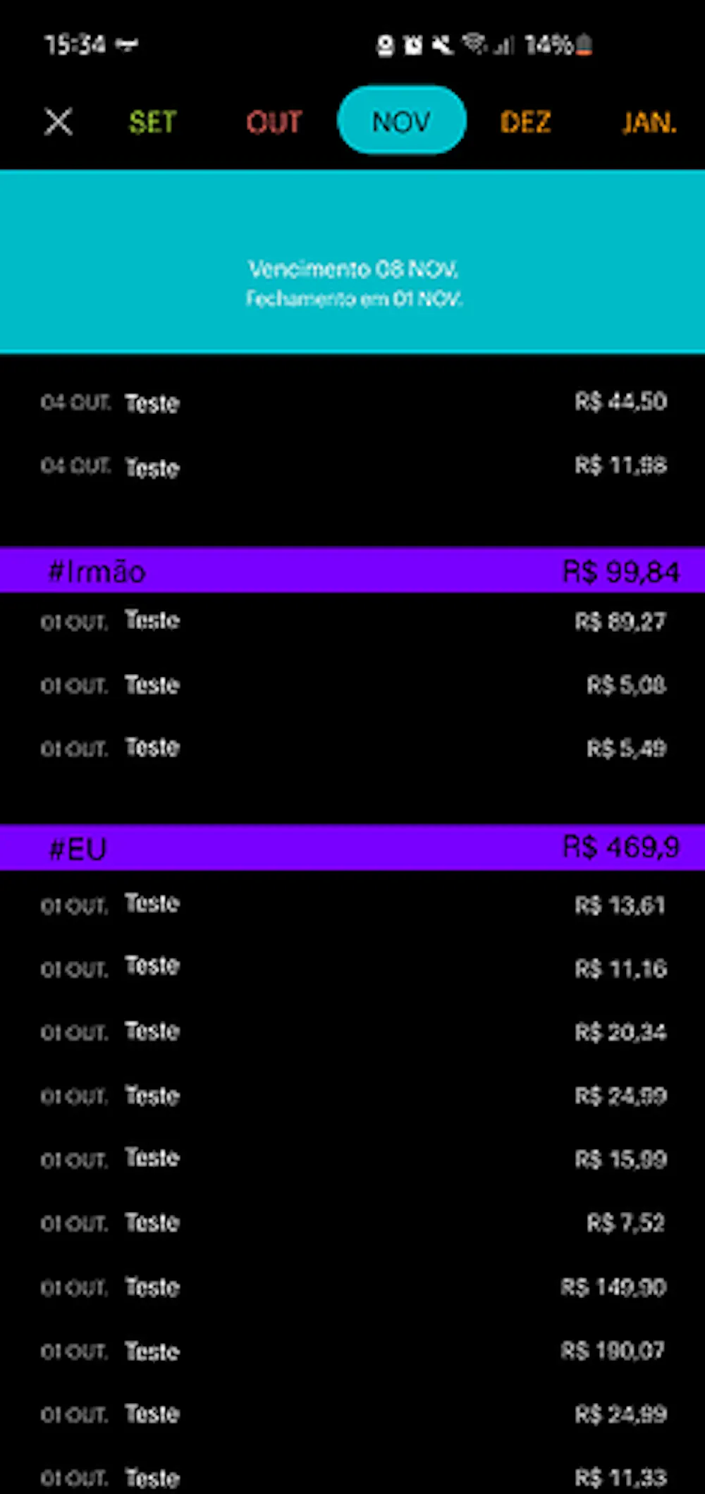 Nesse exemplo que dei, foi de uma fatura aberta onde separa as compras com base nas TAG’s, em cima continuando seu valor total a ser pago e embaixo mostra as compras de forma organizada e separadas.