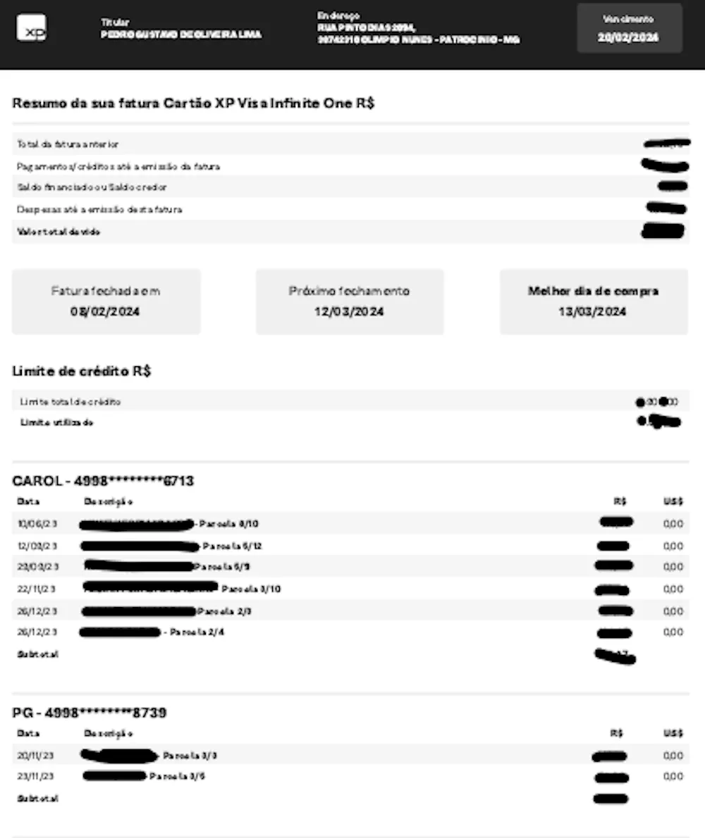 Ainda utilizo o Infinite da XP, que a fatura é exemplar em definir os gastos avençados com cada cartão, tanto pelo nome do cartão quanto pelo número dele (deixo cópia anexa com dados tampados).