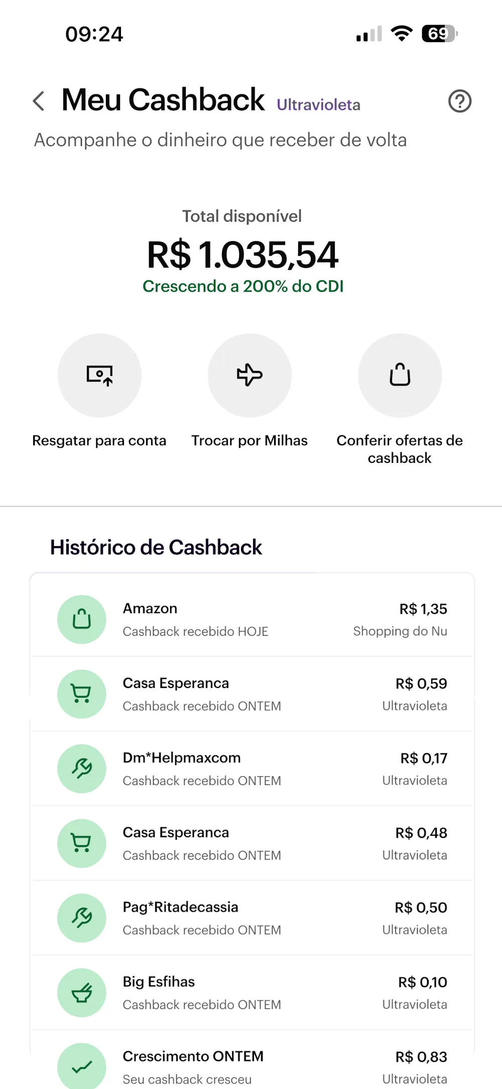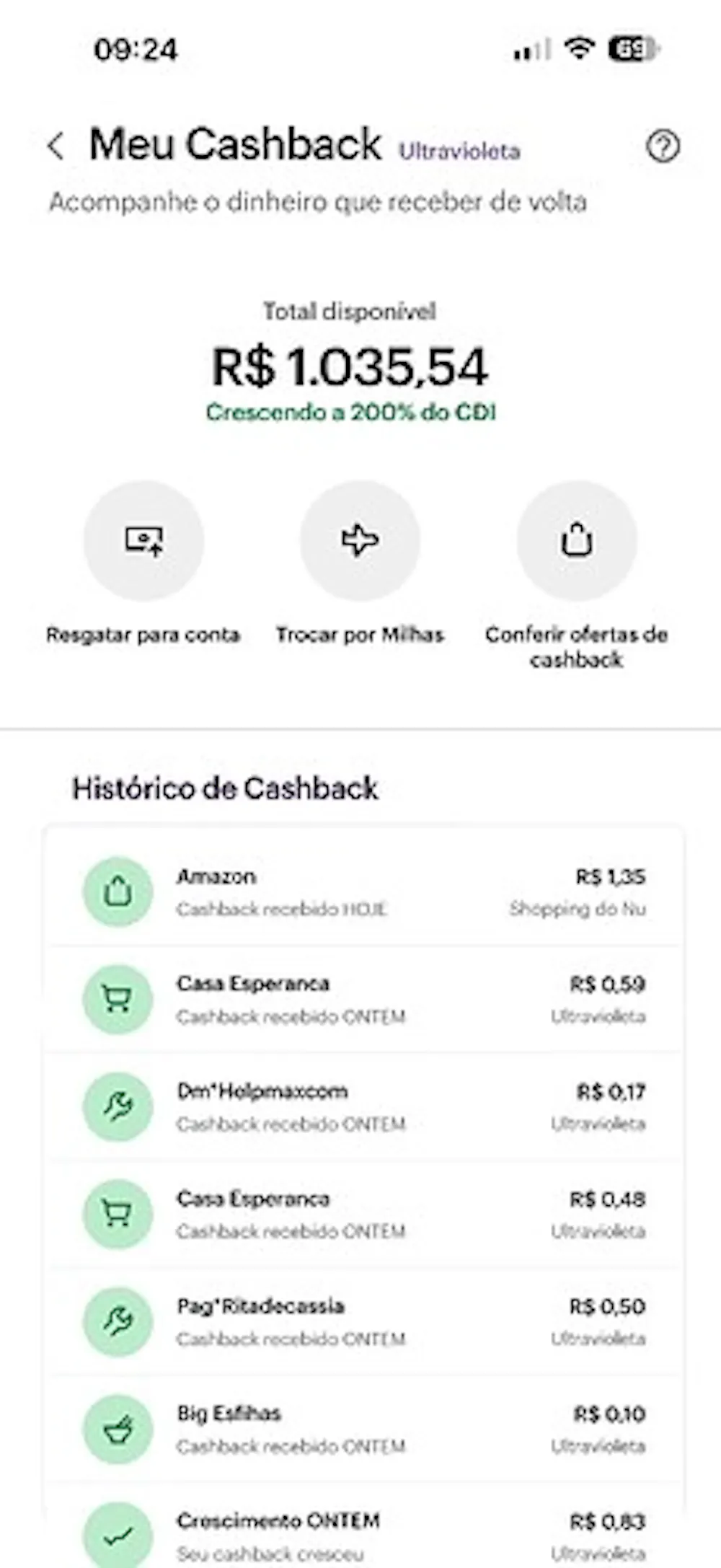 Oi Nubank, gostaria de sugerir que vocês tragam telas distintas para o cashback do cartão ultravioleta e os cashbacks do shopping Nu. Pois atualmente não faz sentido o cliente ultravioleta acessar o botão de cashback da home com finalidade de ver o rendimento do ultravioleta e ter ali os cashbacks do shopping Nu. Além de ficar bagunçado e pouco prático com informações misturadas.