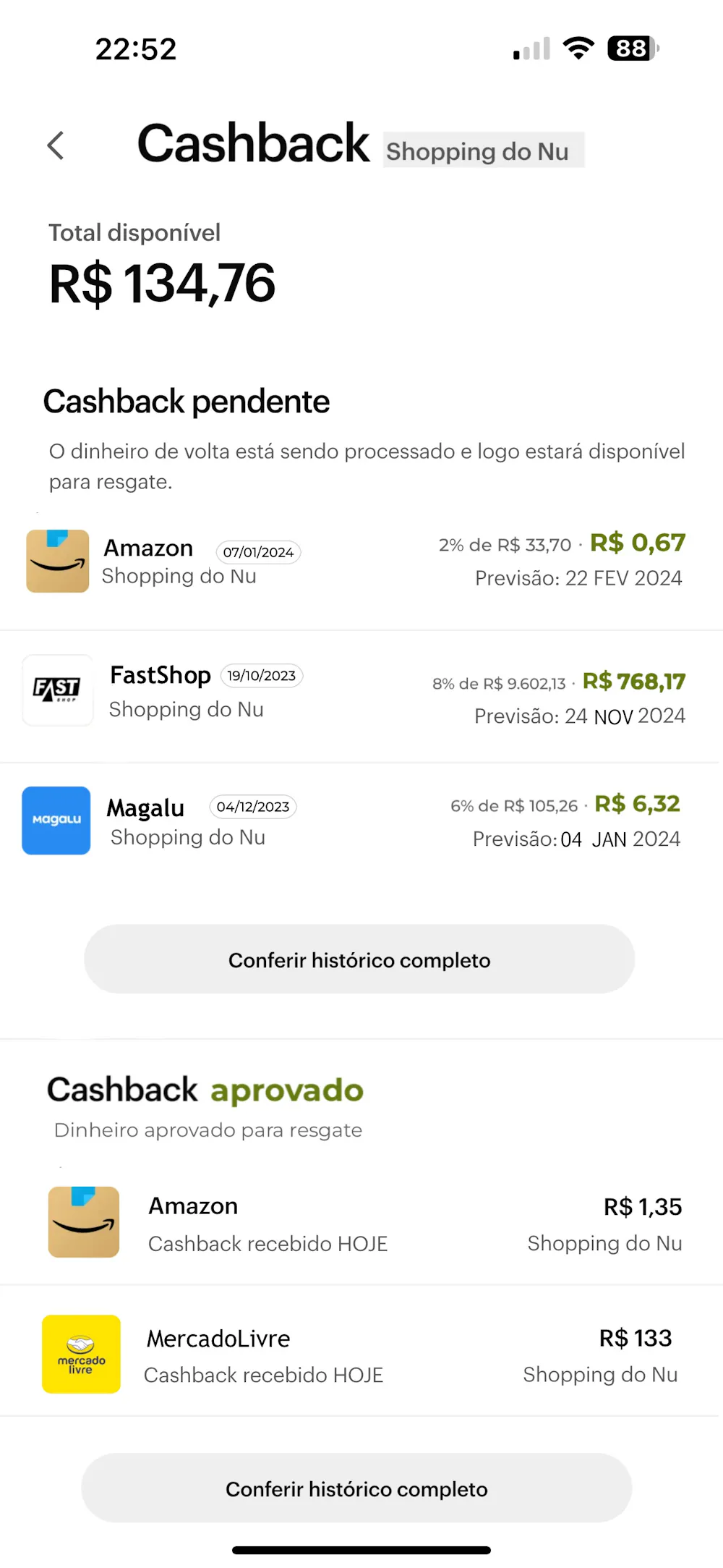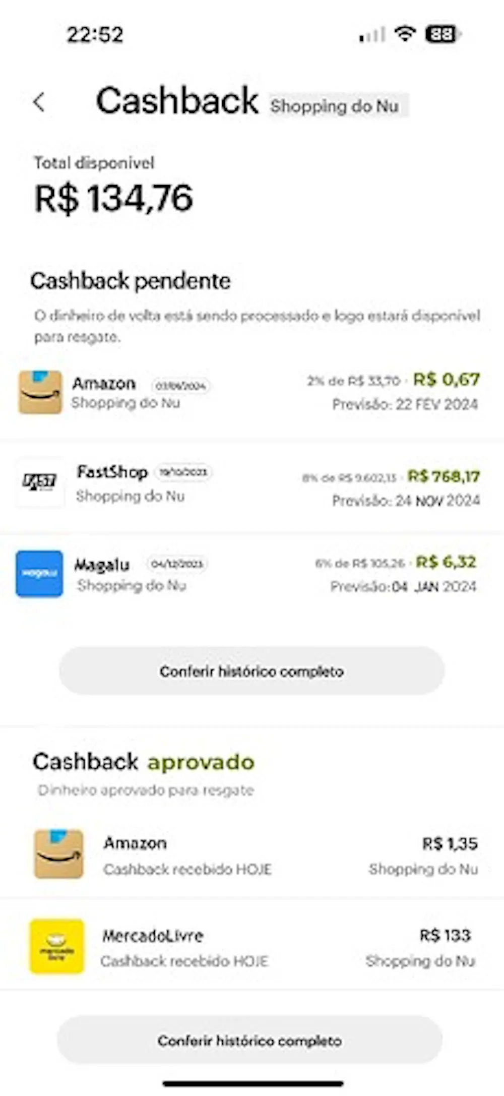 E outra página somente com informações com os cashbacks do shopping Nu que poderá ser acessado pelo atual botão que já tem na página do shopping Nu e tbm com um novo design e inclusão de novas informações que são essenciais para ajudar o cliente a identificar a compra original em caso de problemas com o cashback e para ficar mais claro de onde é aquele cashback com o valor original da compra no site parceiro e porcentagem do cashback ofertado no dia. Ah, e claro uma mudança no prazo para liberação dos cashbacks pendentes dos atuais 90 para 30 dias considerando que a concorrência já pratica isso né. Então sugiro algo parecido com esta imagem