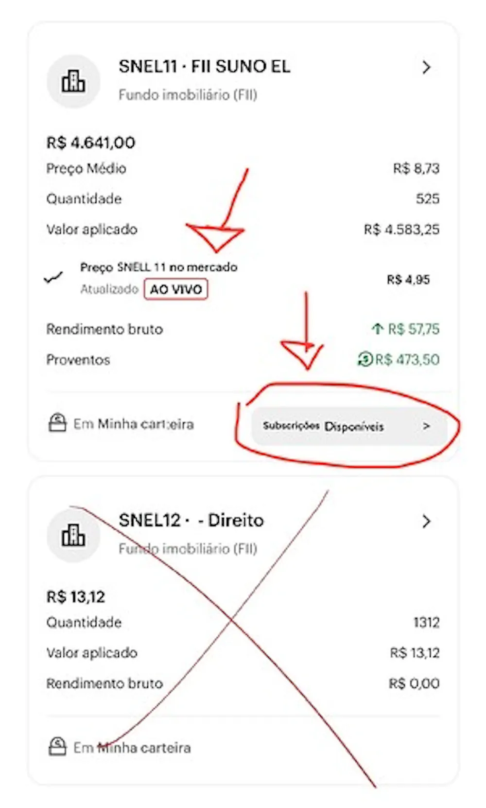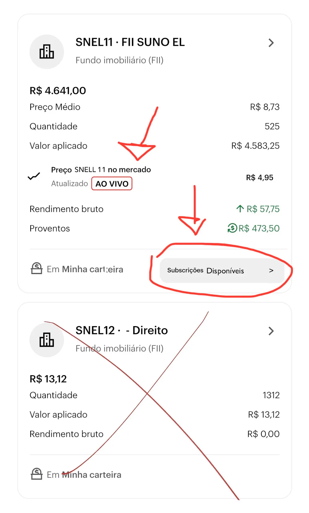 Primeiro sobre a questão de subscrições. Eu tive que entrar em contato com o chat no app pra descobrir onde que eu vejo as opções que estavam disponíveis pra mim com preço médio e opção de comprar porque ao entrar na minha carteira só apareceu está outra informação em baixo como se eu já tivesse comprado outro ativo. E ao abrir não mostrava nada, nem preço médio do direito aparecia. Mas ok, depois orientaram que eu tinha q dar vários toques pra acessar a área da bolsa e lá tinha a opção de subscrição.