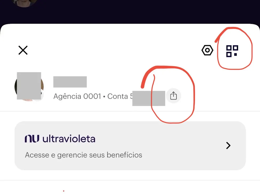 Agora para a página do perfil, quando a gente toca na nossa foto ali né. Atualmente o Nubank disponibiliza um botão que na verdade é um texto selecionável escrito MAIS que permite abrir uma página com os nossos dados da conta para compartilhar. Então primeiro eu sugiro que troque para um ícone que indique que é um botão de compartilhar igual eu ilustrei na imagem a baixo.