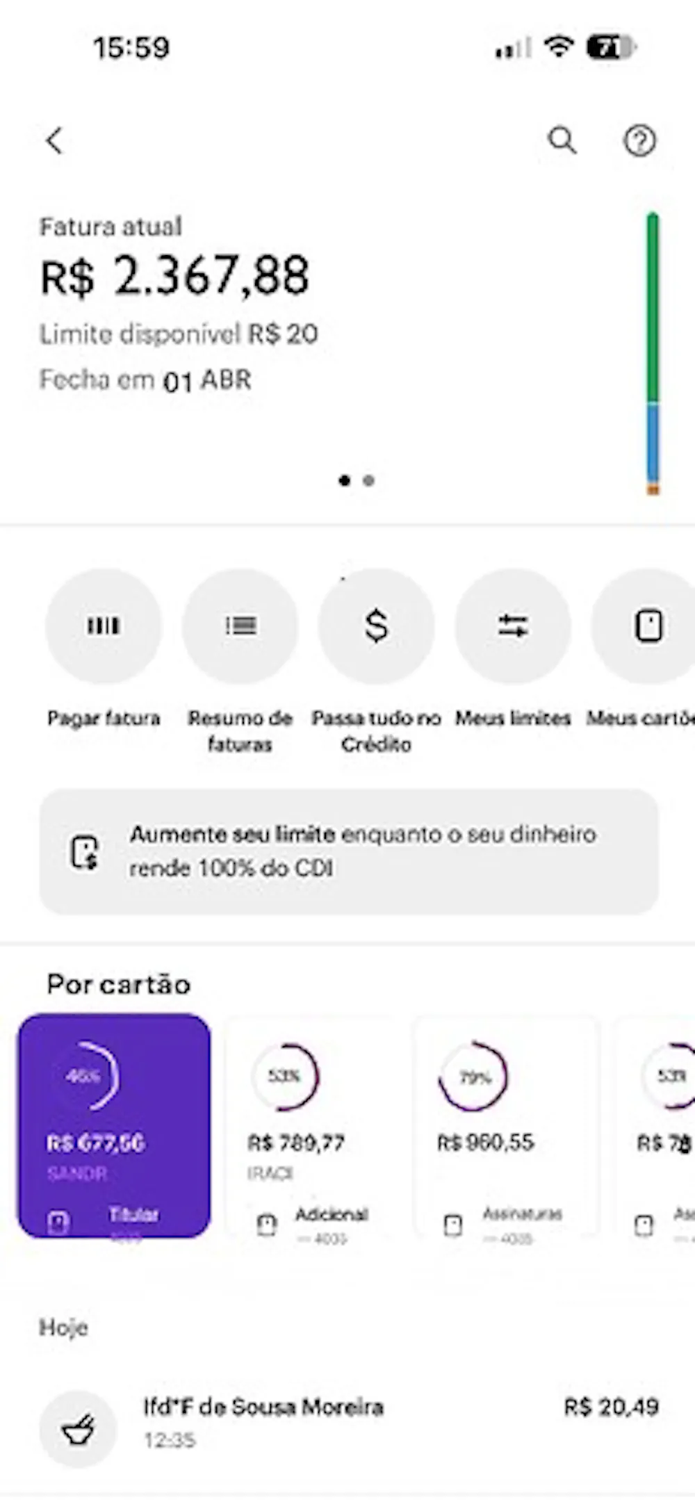Baseado nisso acho que ficaria bem prático, organizado e moderno se o Nubank trouxer algo parecido com isso na área de cartão de crédito. Com cards desse jeito mas de cada cartão ativo na conta, os adicionais e virtuais para o cliente acompanhar o total gasto de cada um até aquele momento, e inclusive usar como filtro para ver os gastos de cada um no histórico de transações e qualquer configuração deles. Tirando aquele botão da home de “meus cartões” e centralizando tudo na área do cartão de crédito. Algo parecido com isso: