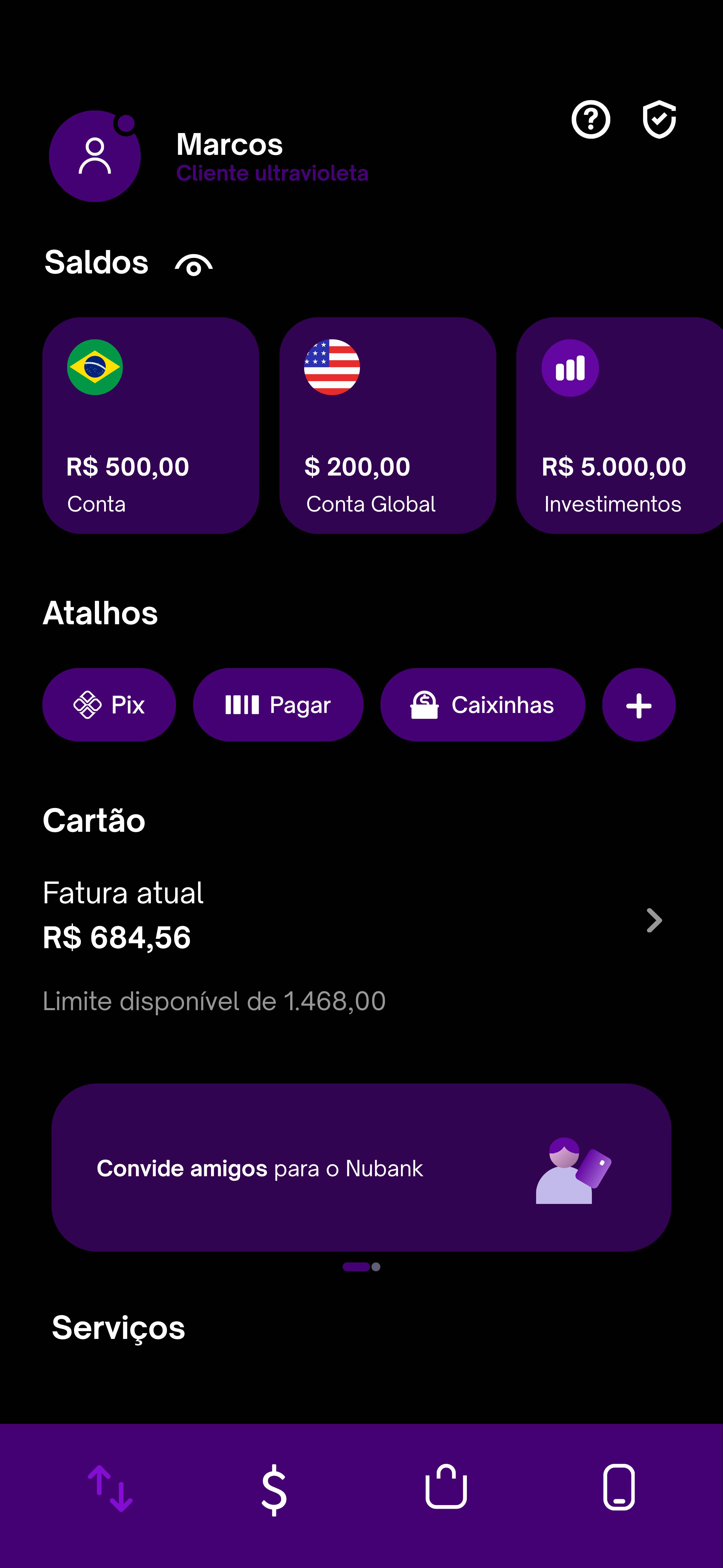 Sempre achei a tela inicial e demais abas do Nubank super intuitiva e agradável visualmente. Mas acho que atualmente está sofrendo com o excesso de informações e bem defasada. Criei uma ideia de redesign para a tela inicial do app, que une simplicidade, sofisticação e modernidade. Tudo que define a NuConta. Estão em anexo as ideias ilustradas. Incluíndo o modo escuro e as telas para diferentes tipos de clientes (Ultravioleta e Nubank +)