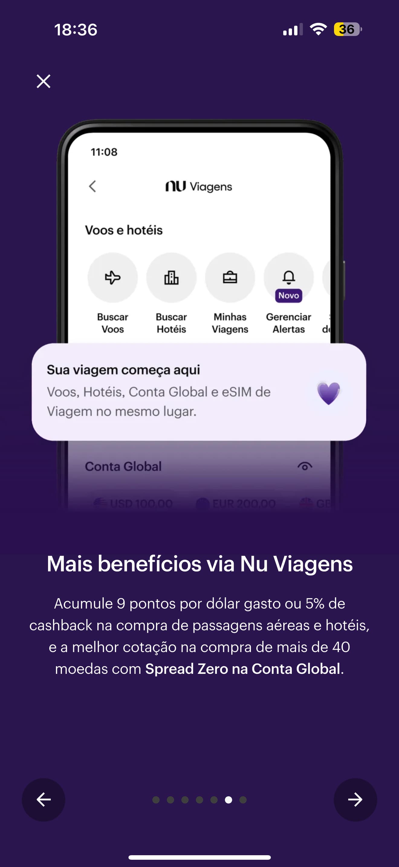 Anuidade zero, cashback em dólar, pontos não expiram, seguro viagem, Fast Pass GRU, Concierge 24h Visa, descontos Nomad Trips 5% |