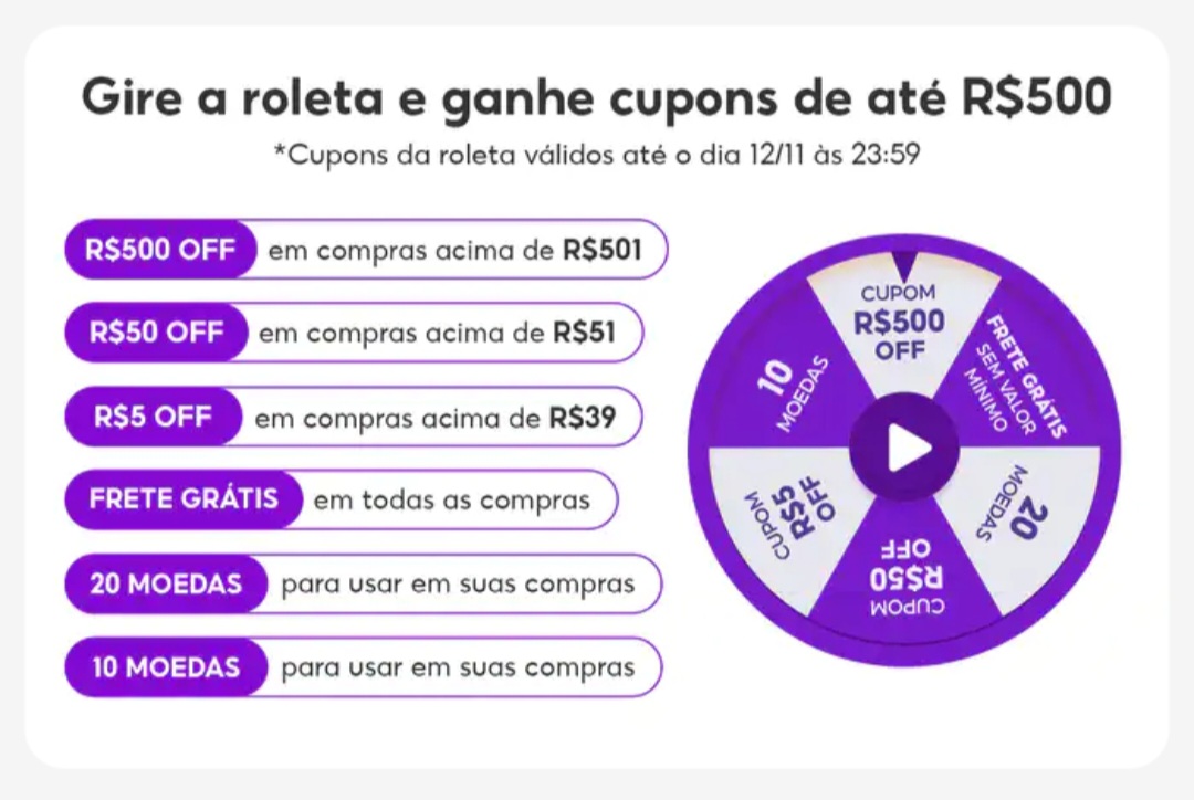 10 moedas, mas estou feliz com o cupom normal, tô vendo muitos girando a roleta e conseguindo o cupom de 500 reais.