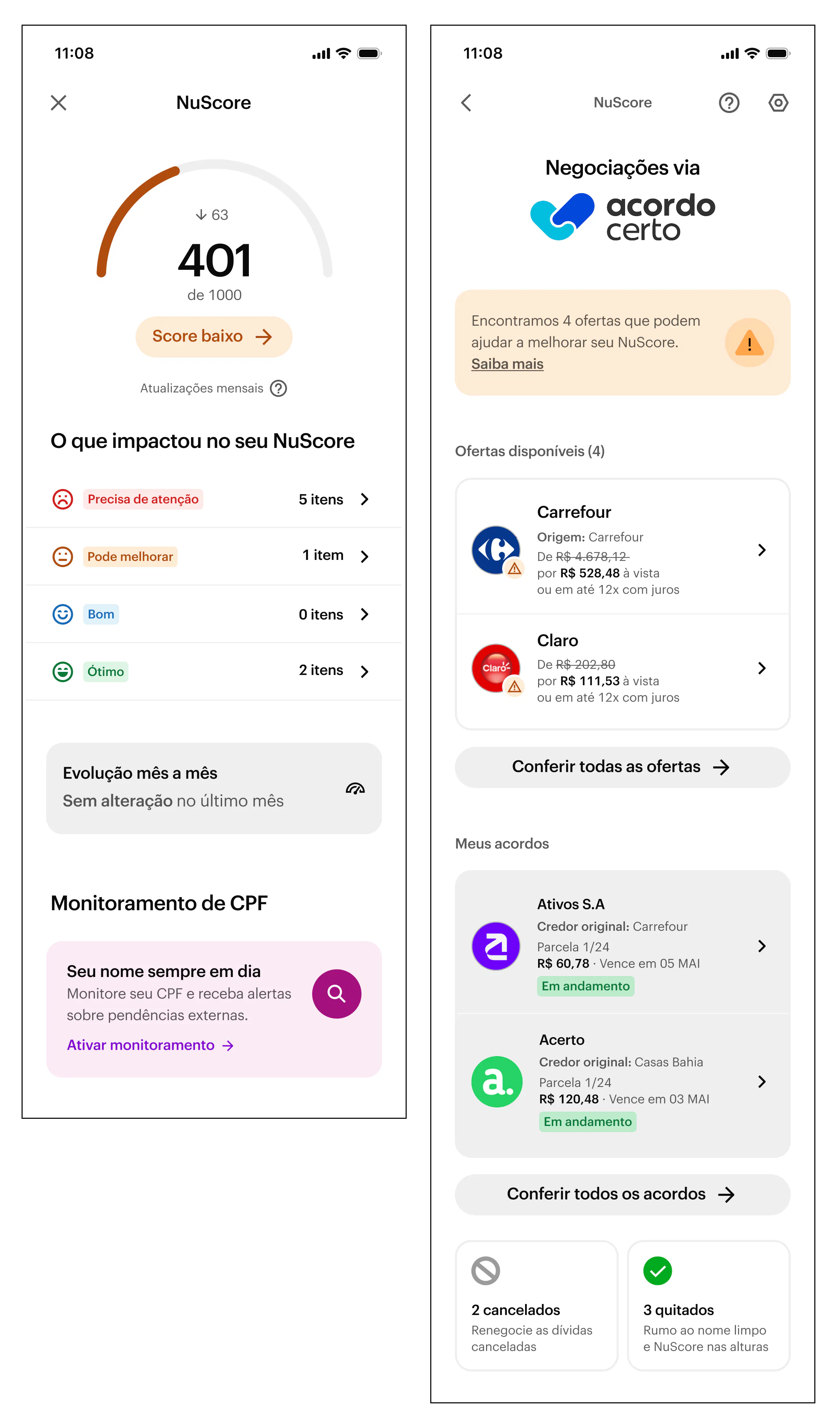 Transparência com NuScore: Maior visibilidade sobre comportamentos que impactam sua pontuação de crédito, tanto no Nubank quanto no mercado.