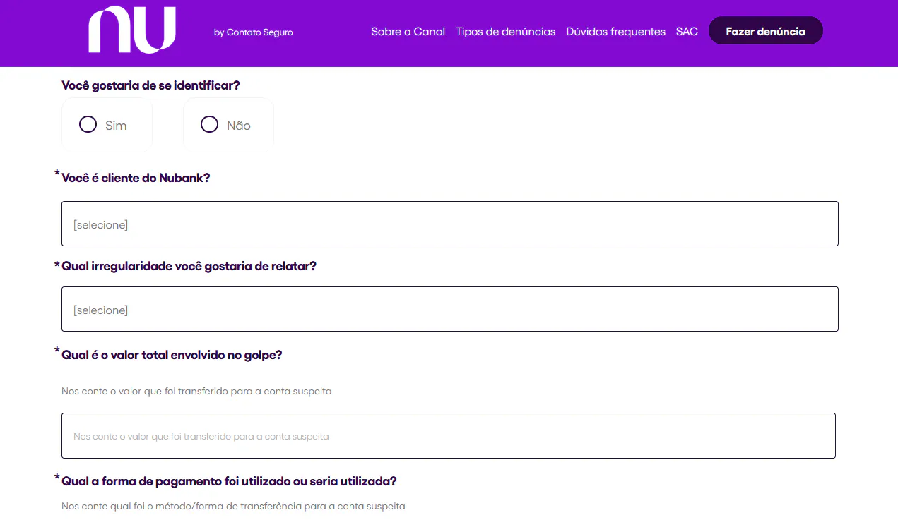 Sinceramente, pessoal, será que não existe uma forma mais simples das pessoas voluntariamente ajudarem o banco a combater os golpes virtuais??? O próprio Nubank coloca empecilhos, entraves, questionamentos que trabalham em oposição a finalidade do próprio canal. Francamente...