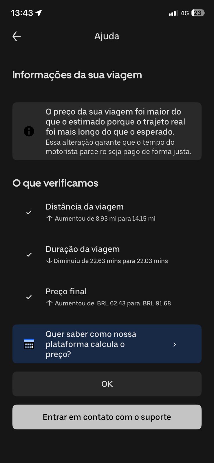 A própria UBER mostra que não faz o menor sentido o que foi feito e que ele desviou da rota e me cobraram 46% a mais da corrida!