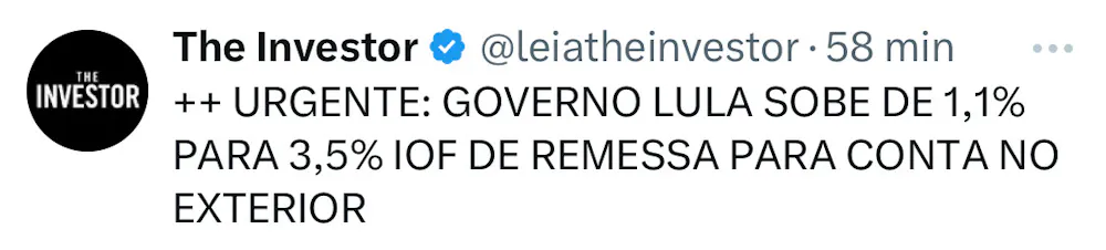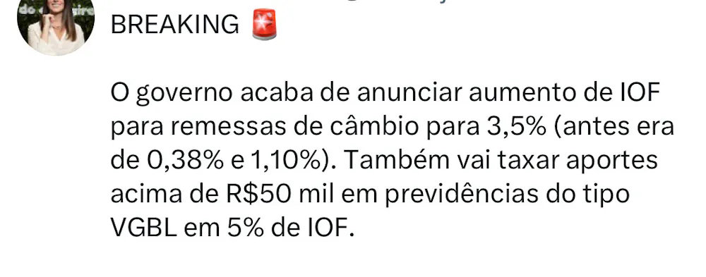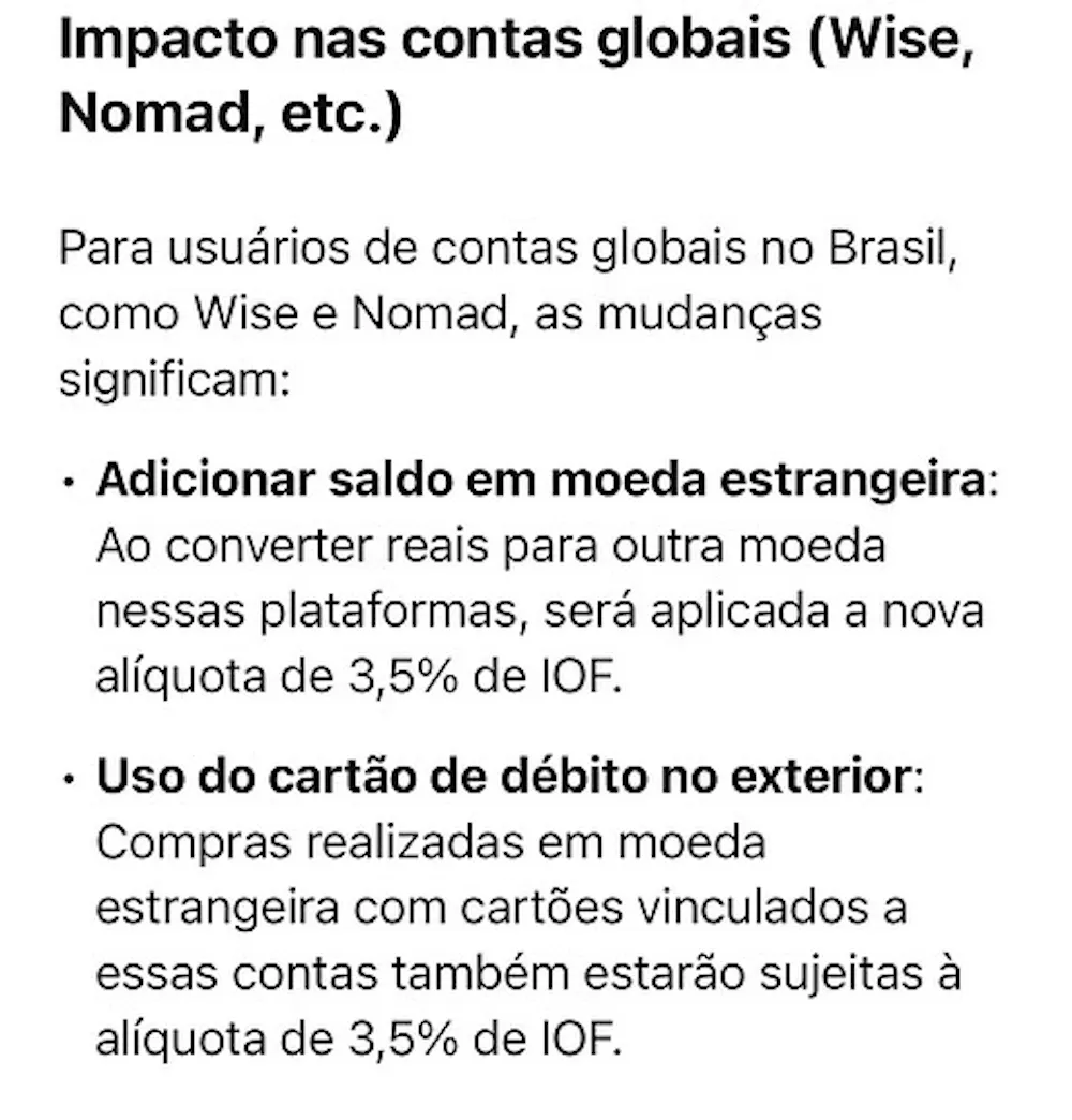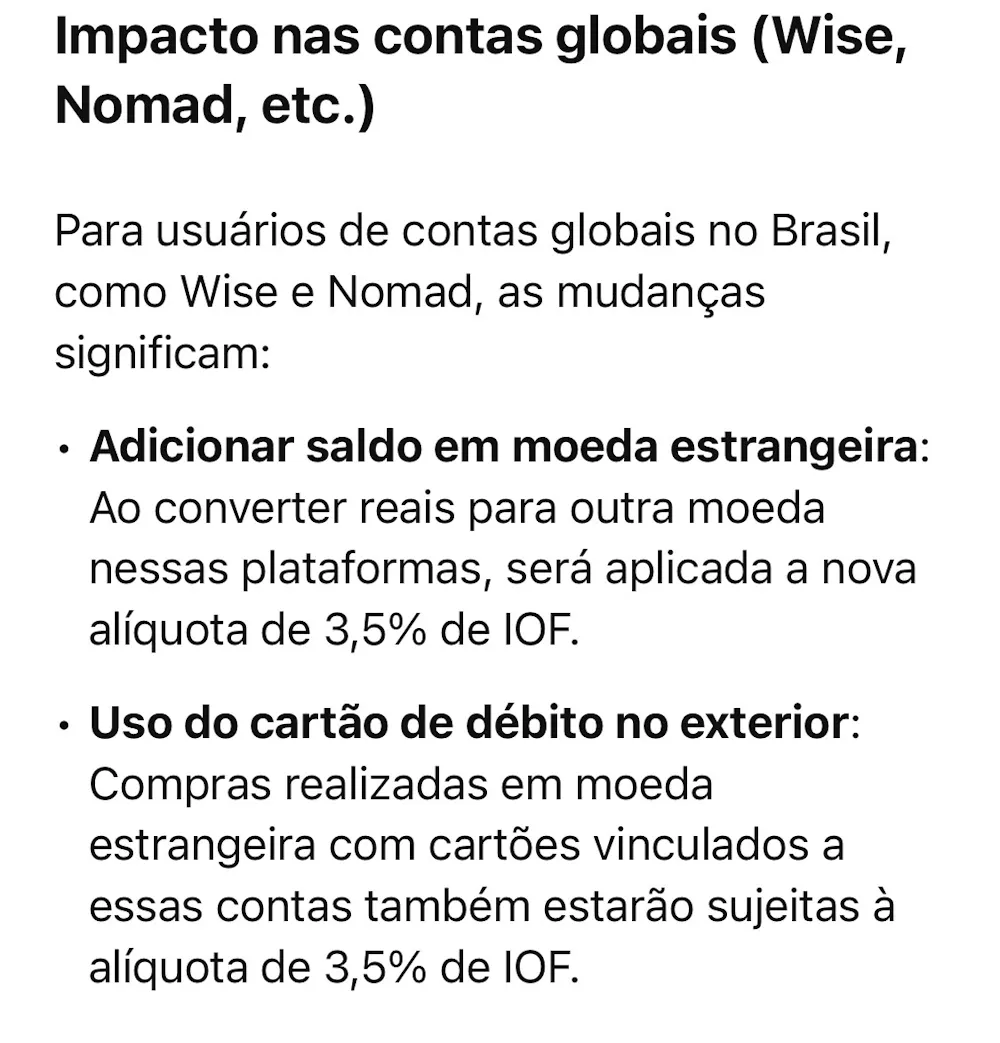 Governo federal anunciou hoje, 22 de maio de 2025, um aumento no Imposto sobre Operações Financeiras (IOF) para 3,5%. Antes o IOF era 0,35% para outros beneficiários e 1,1% para transações de mesma titularidade. Esta mudança afeta diretamente operações de câmbio, incluindo o uso de contas globais como Wise, Nomad e similares. Além de investimentos em previdência.