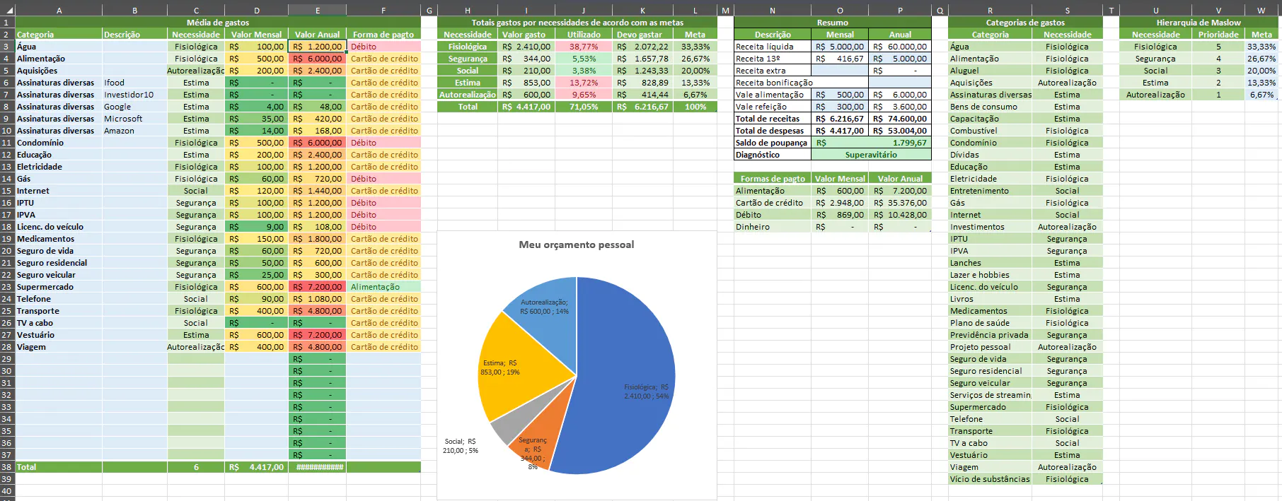 Para quem deseja colocar esse modelo em prática, existe uma planilha totalmente gratuita que eu mesmo desenvolvi, que ajuda a organizar o orçamento pessoal a partir da Pirâmide de Maslow, separando os gastos por níveis de necessidade.