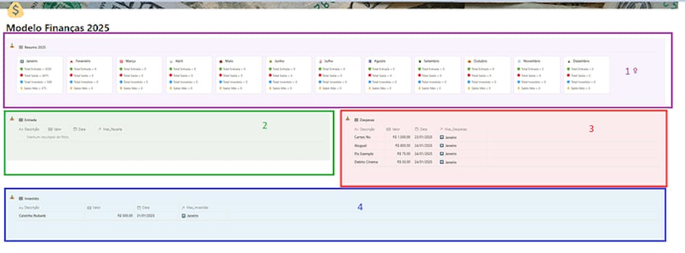 O template é dividido em quatro quadros principais, facilitando a visualização das finanças de forma clara e objetiva: