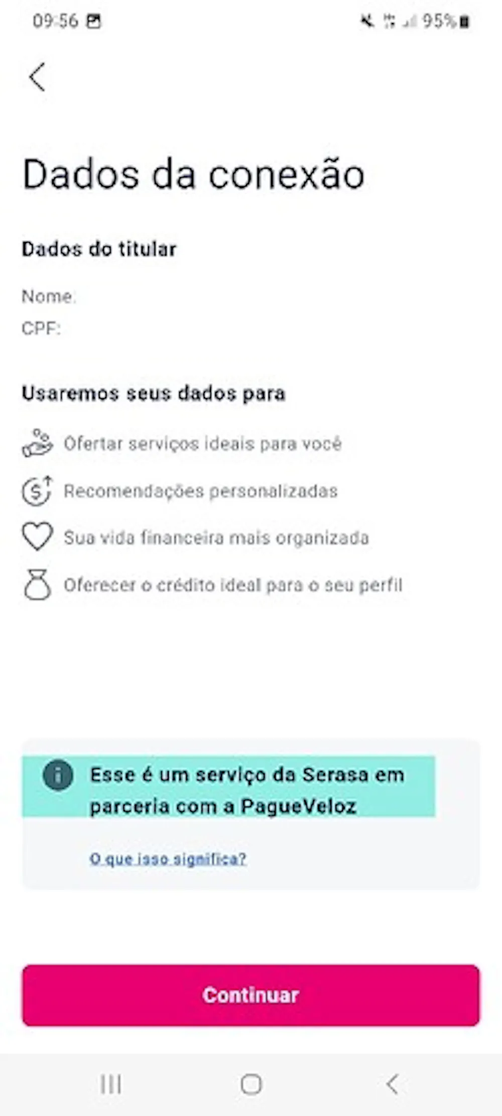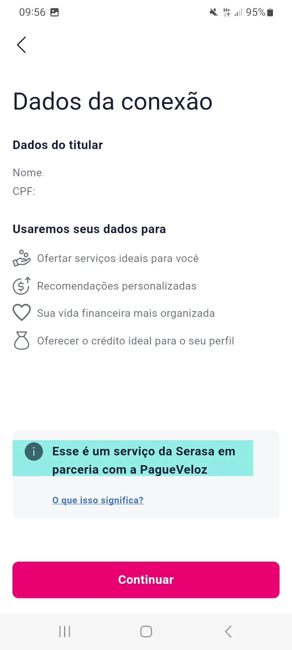 Foi assim que ela pôde aderir ao Open Banking. Agora quando fazemos a conexão bancária, não é mais solicitado a senha do aplicativo do banco. Pelo que andei pesquisando, através do Open Banking, nossos dados são compartilhados com a PagueVeloz, que por sua vez repassa as informações à Serasa.